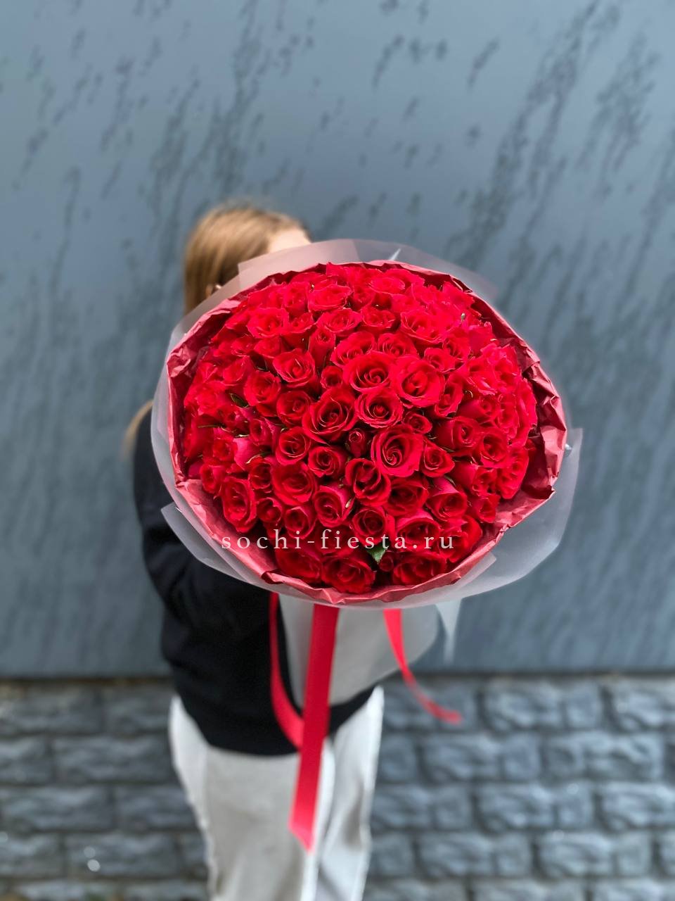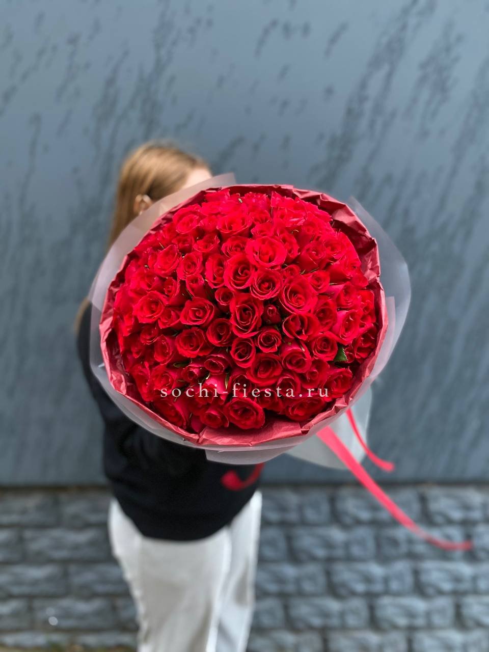 Сто один бутон образует плотную красную сферу с безупречной геометрией. Кенийская роза отличается густотой лепестков и насыщенным оттенком который не теряет глубину даже при ярком свете. Букет держит форму и впечатляет масштабом.