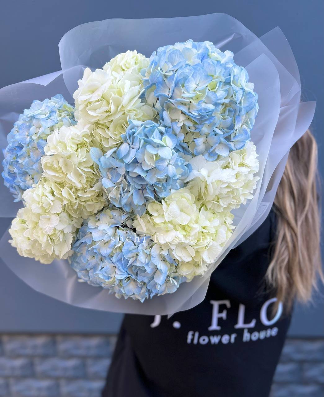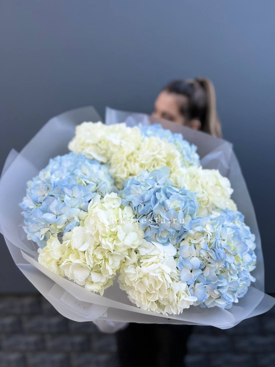 розовые гортензии, эвкалипт, пленка.