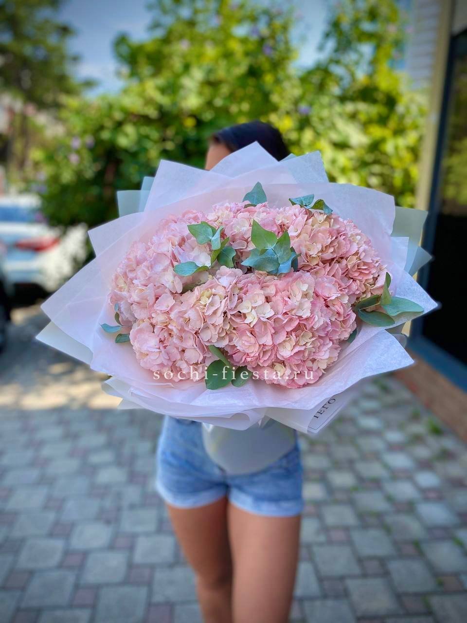 гортензия - 5 шт., эвкалипт,  лента, дизайнерская упаковка.
