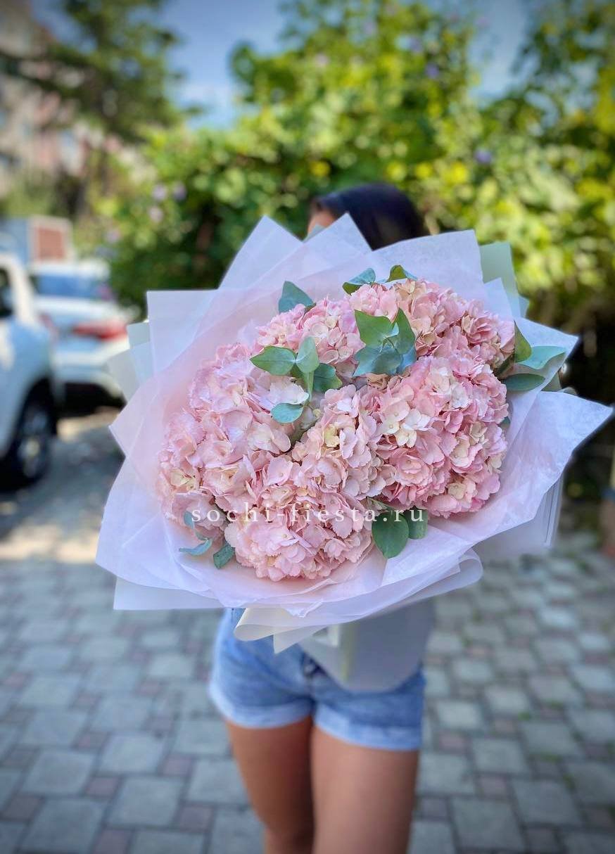 Пять соцветий розовой гортензии в обрамлении матовых веточек эвкалипта. Сочная палитра и продуманная форма делают этот букет удобным для размещения даже в компактном пространстве.
