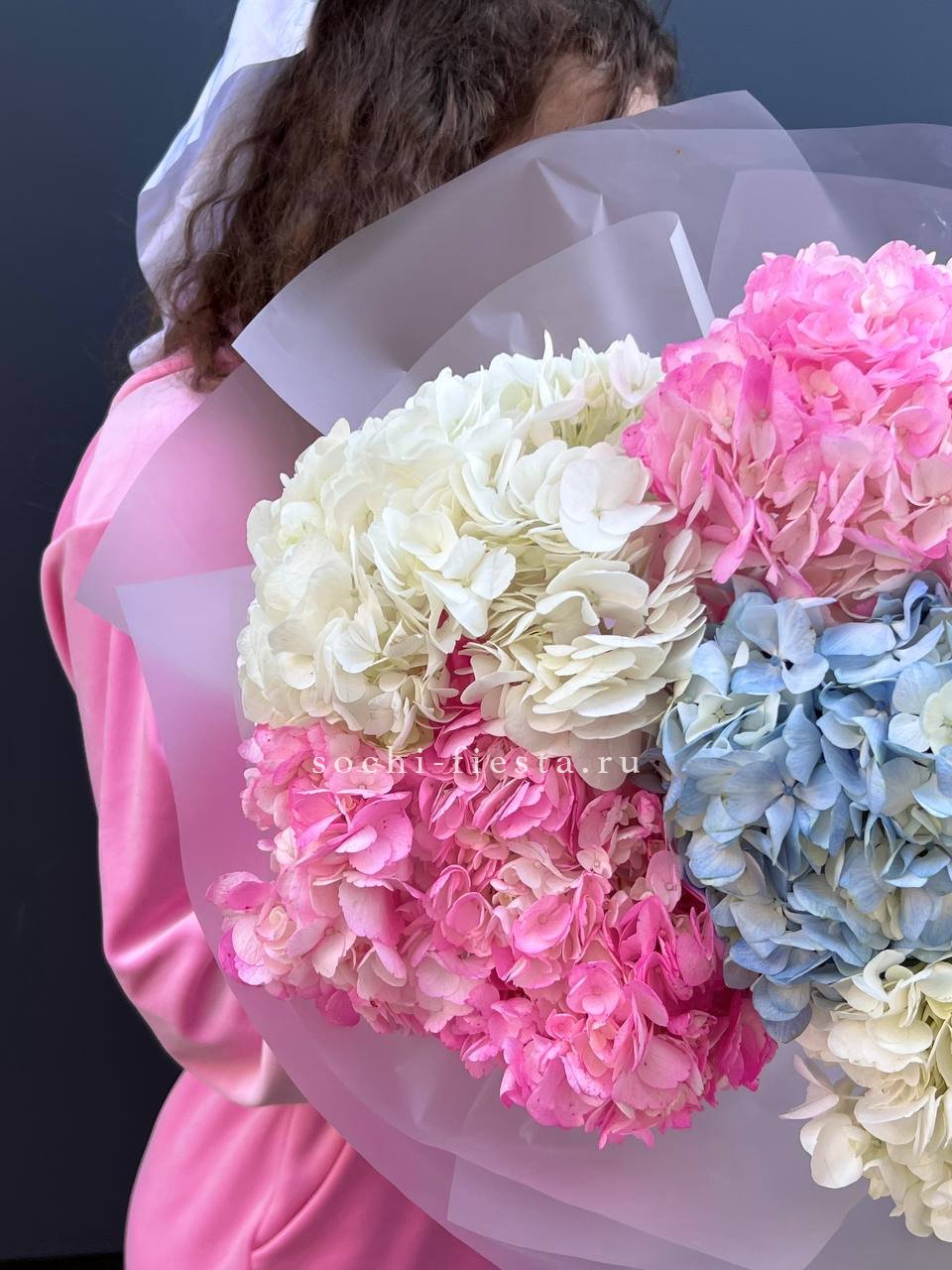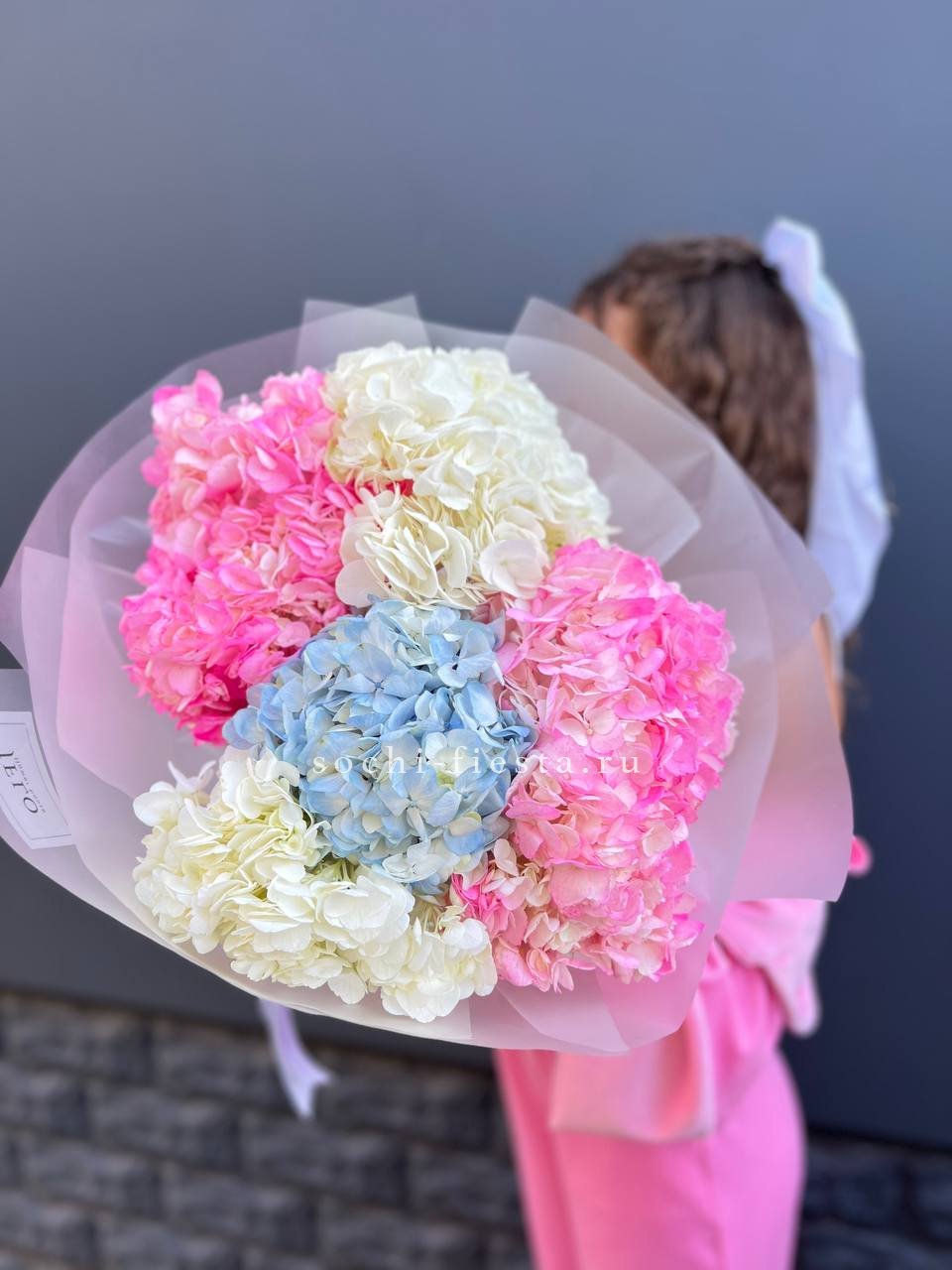 гортензия нежно-розовых оттенков, эустома, львиный зев или маттиола, розовые розы, эвкалипт, вспомогательная зелень, лента, светлая корзин.