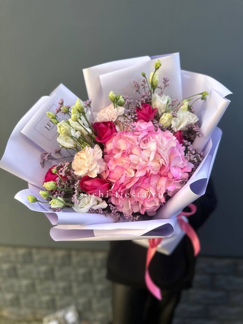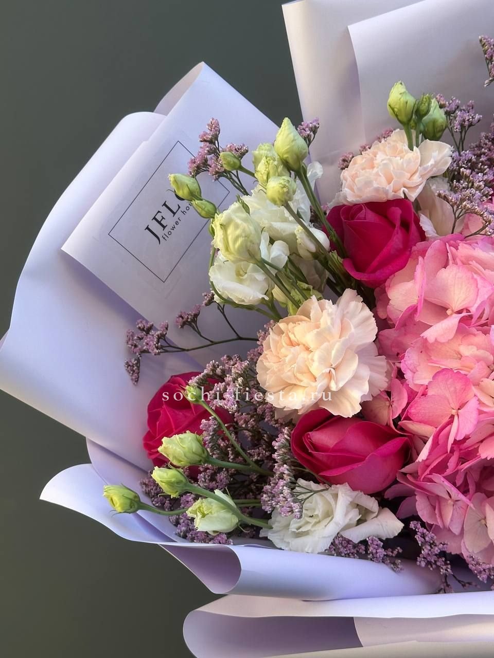 гортензия, вывернутые розы, диантус, кустовая роза, диантусы, оформление в боксе.
