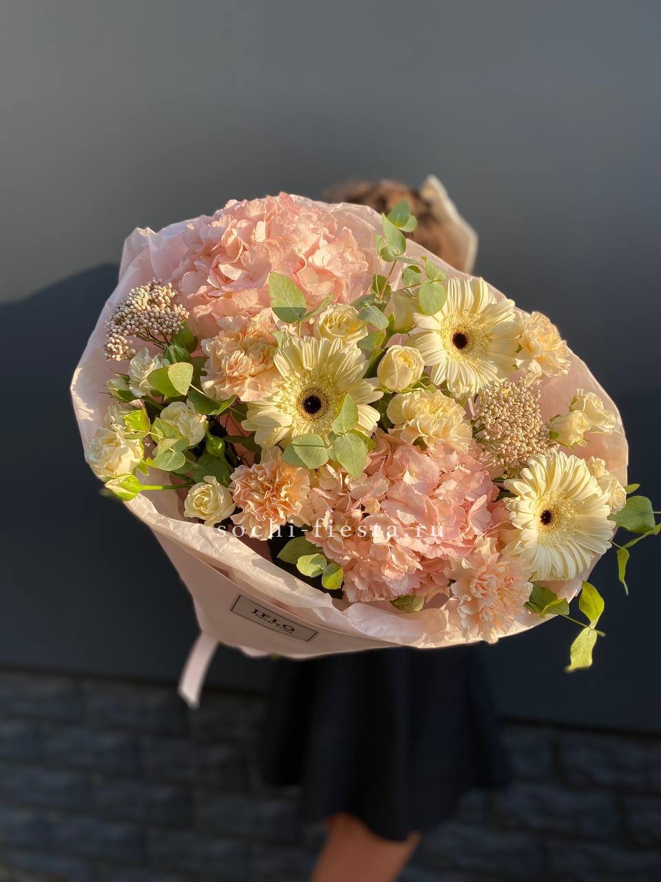 Многослойная композиция с герберами, эустомой и гортензией образует плавные переходы оттенков. Антиринум вытягивает силуэт вверх, придавая букету лёгкость и воздушность.