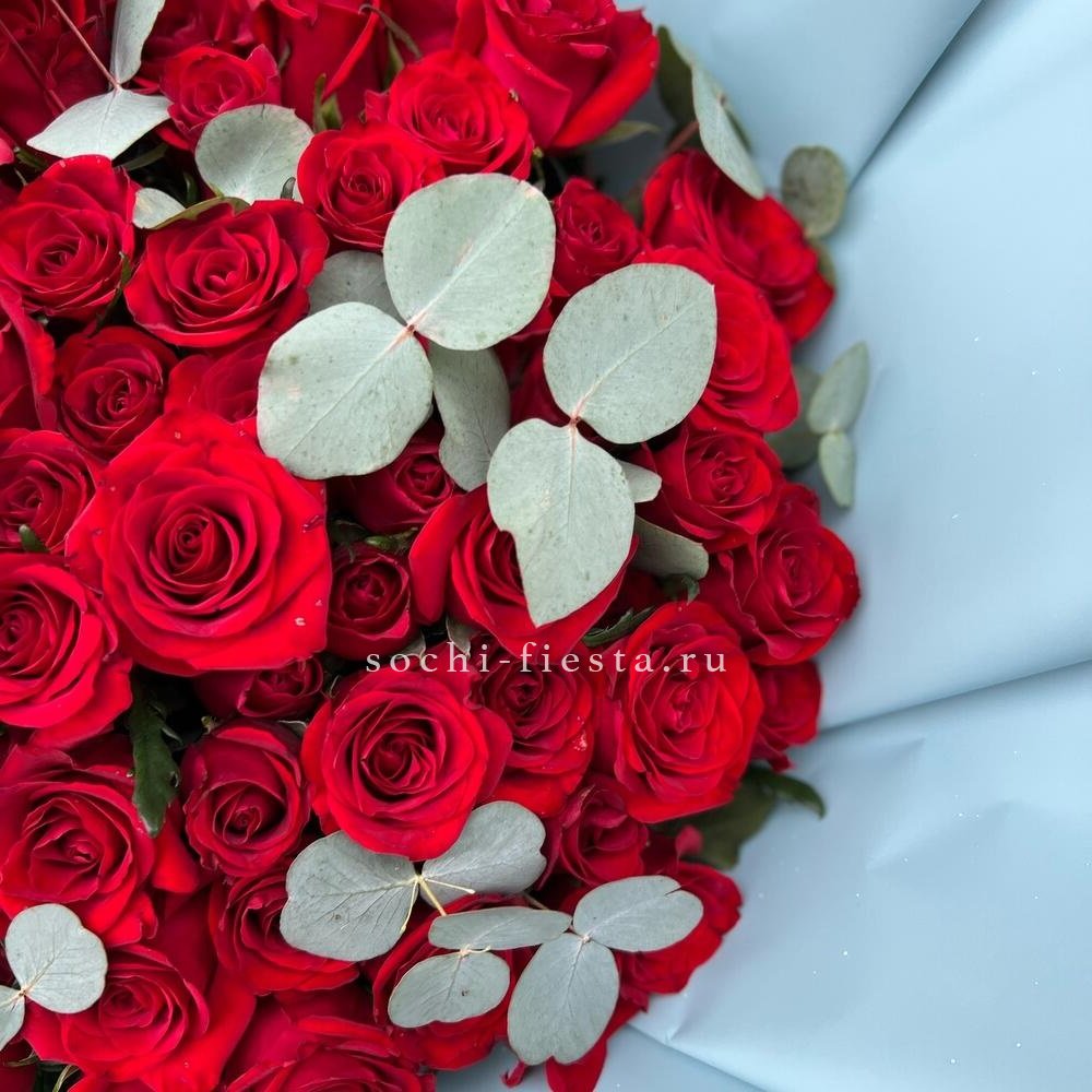 Девять вывернутых роз с насыщенными лепестками создают объёмную композицию. Эвкалипт добавляет свежести и визуальной лёгкости между бутонами.