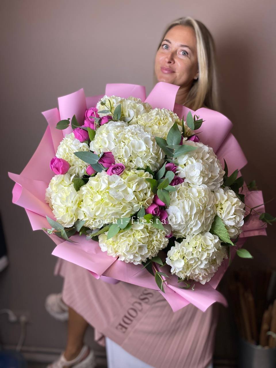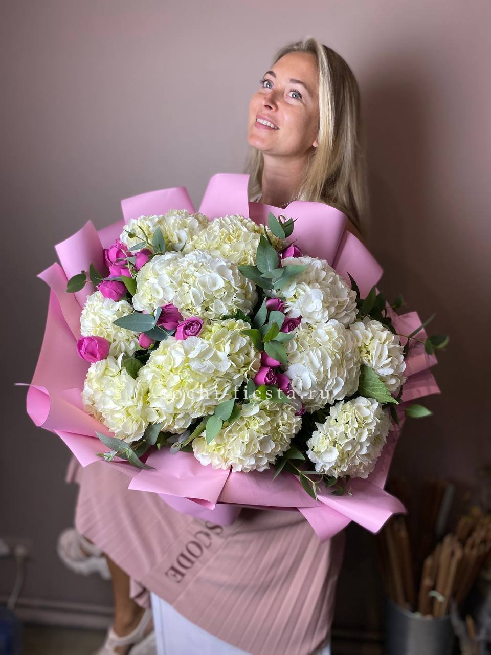 гортензия, хризантема, белая роза, гербера, статица, хлопок, упаковка.