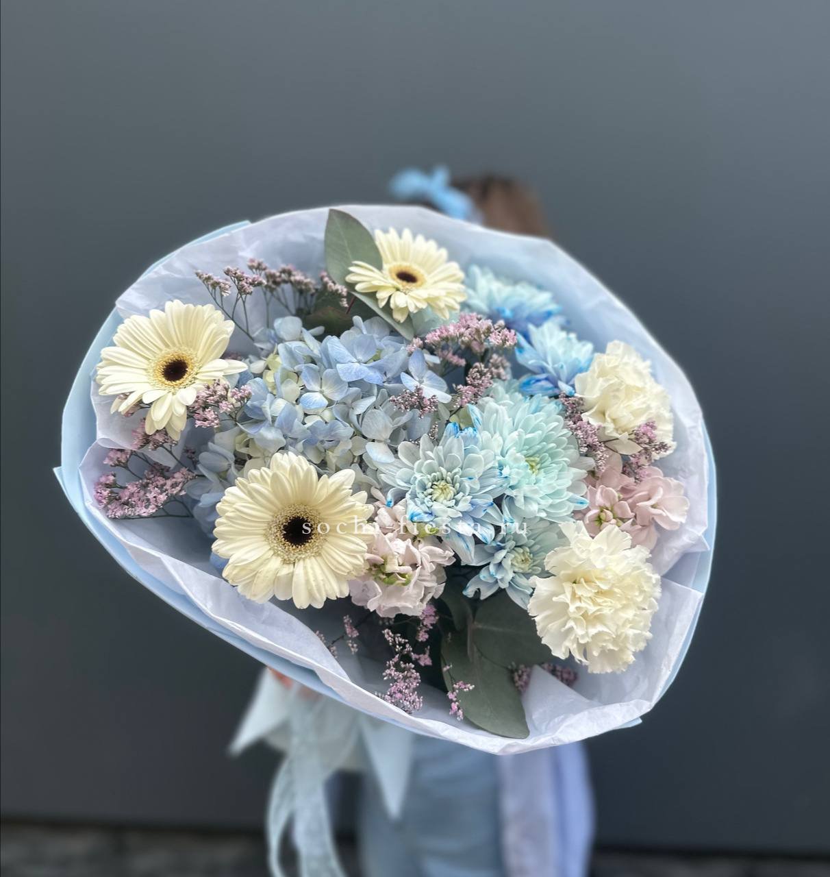 букет из нежных стойких цветов диантусов, роз, хризантем, маттиолы(возможна замена на эустому), озатамуса, бомбастика в воздушном оформлении.
