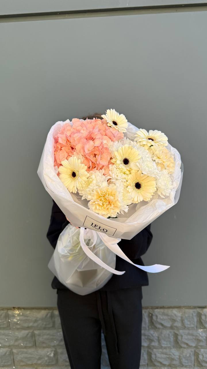 Сочетание воздушной гортензии и классических гербер в одном букете. Этот микс — идеальный баланс между нежностью и стилем. Тот самый подарок, который мгновенно преображает пространство и дарит ощущение праздника. Идеальный выбор для тех, кто вдохновляет на самое лучшее.