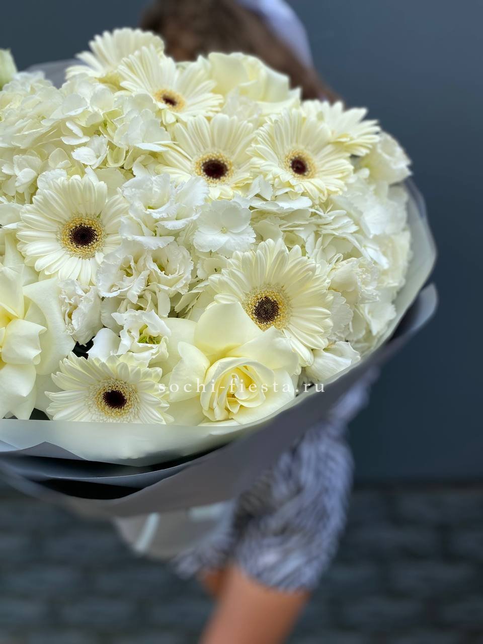 Белые розы, герберы и соцветия гортензии образуют плотную композицию с чёткими линиями. Эустома добавляет воздуха между крупными бутонами, а дизайнерская упаковка завершает форму.