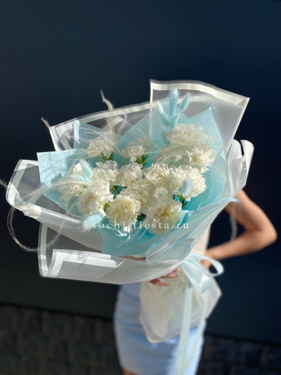 Диантусы с их густыми бутонами и резной формой лепестков выглядят графично и современно. Белый цвет усиливает архитектурность линий и создаёт чёткий визуальный ритм.