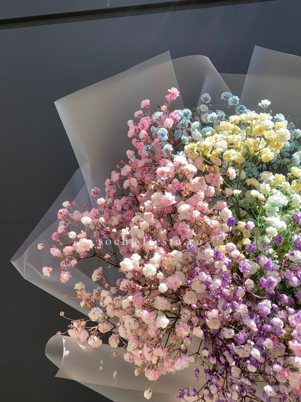 Семь веточек гипсофилы в радужной палитре собраны в компактную форму. Яркие переливы оттенков наполняют пространство живой энергией.