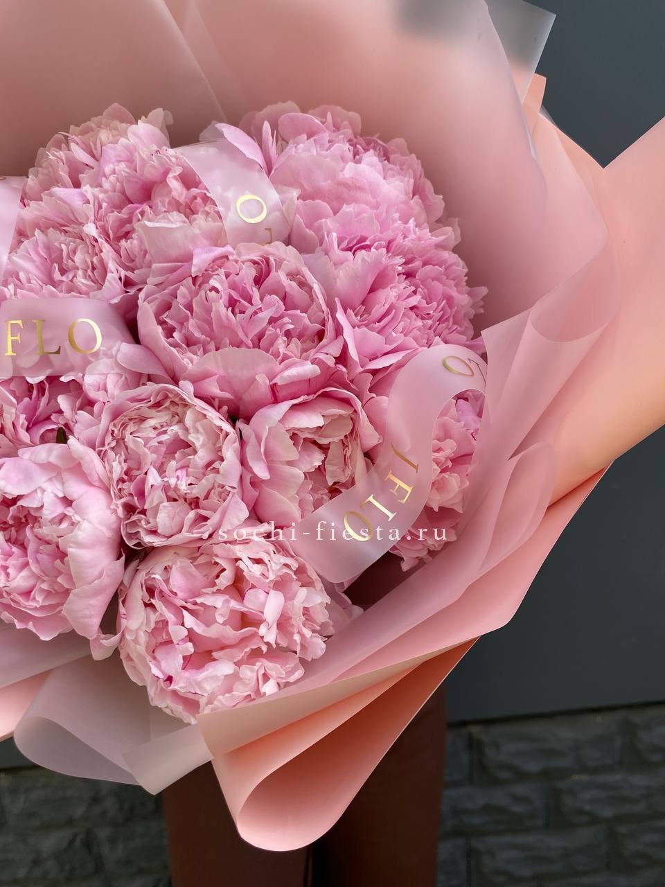 15 розовых местных пионов, лента, комбинированное оформление.