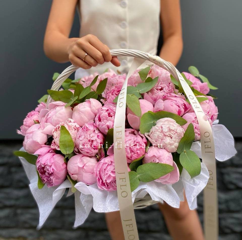 29 пионов, эвкалипт, корзина, лента.