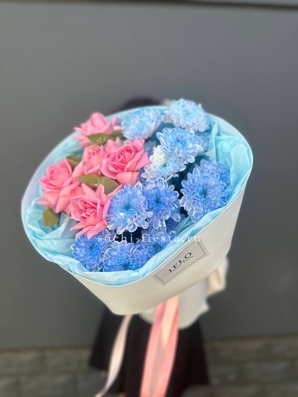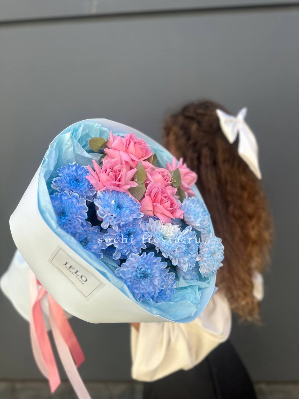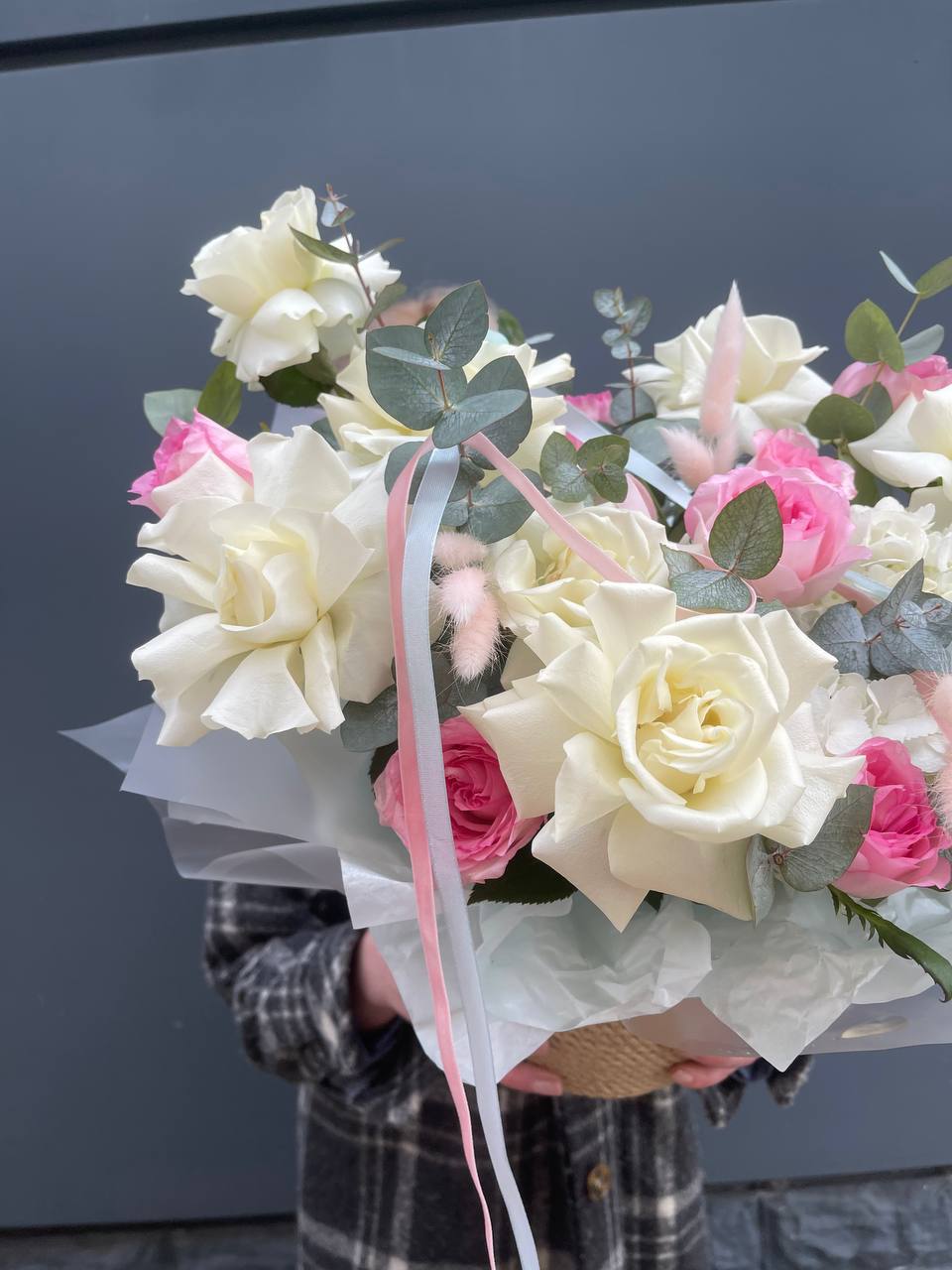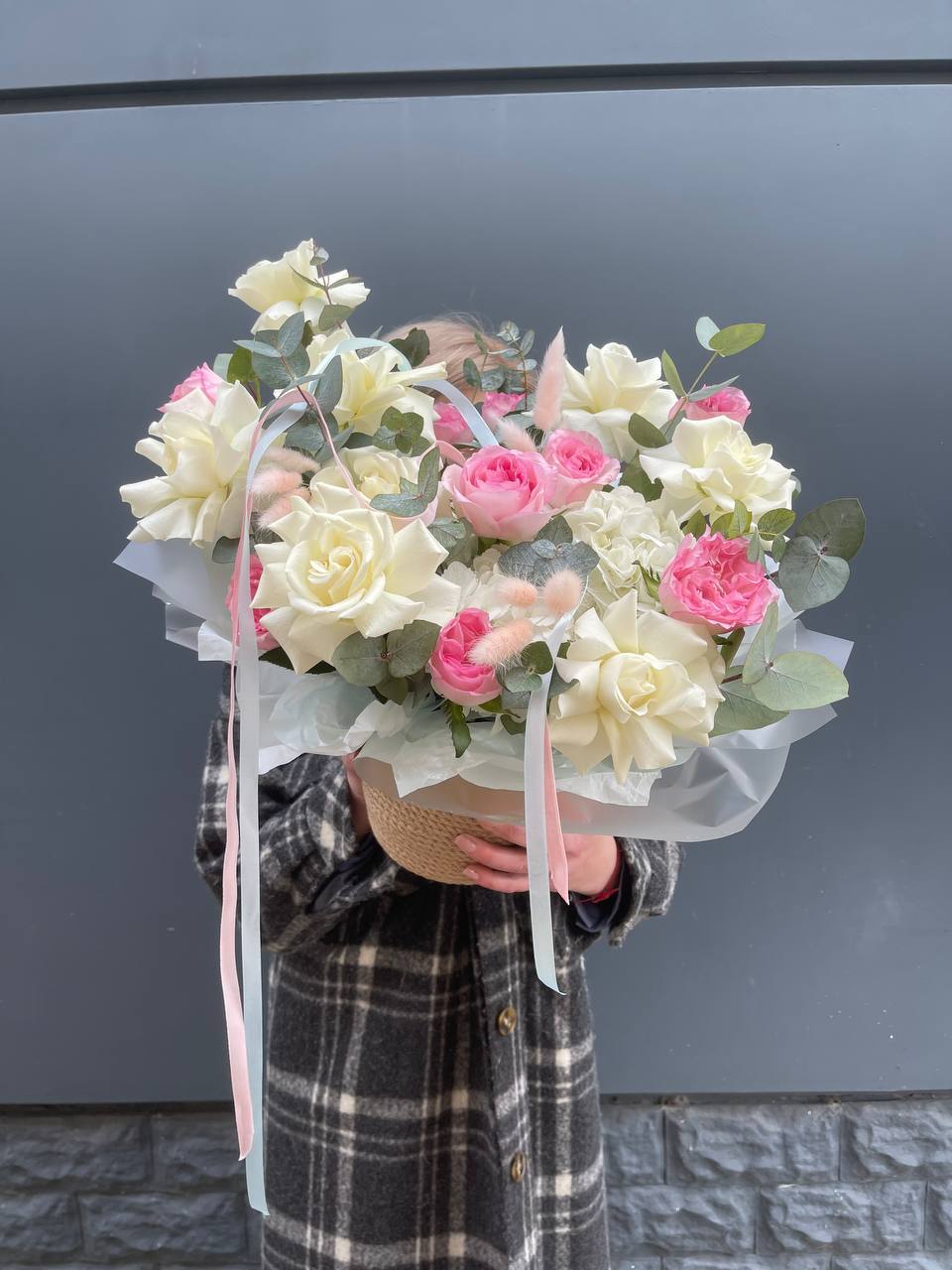 гортензия, диантус, роза, кустовая роза, эустома, эвкалипт, лента, авторская упаковка.