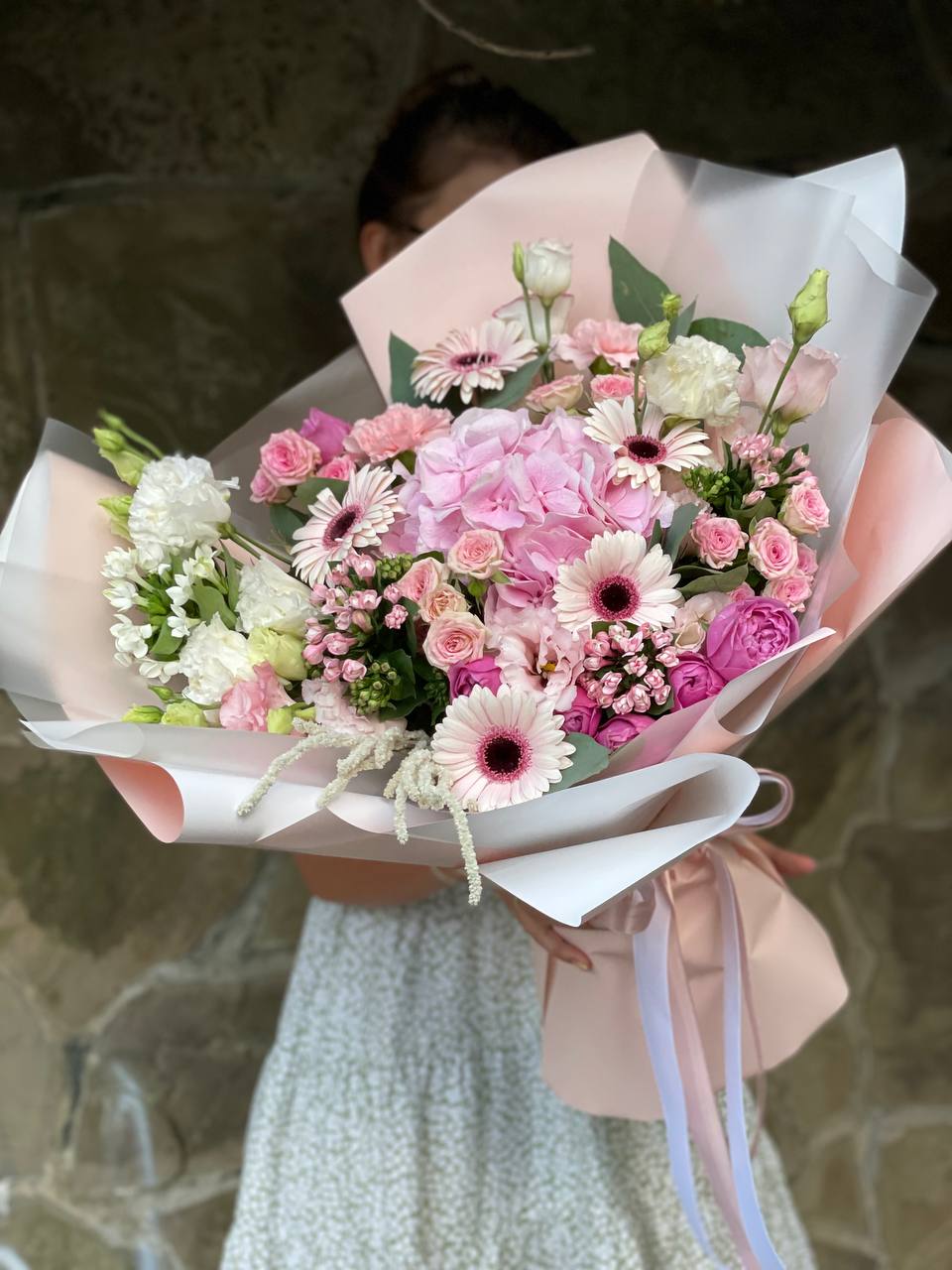 гортензия, диантус, мисти бабблс, астильба или аналог, гербера, кустовая роза, бовардия, эустома, эвкалипт, авторская упаковка, лента.