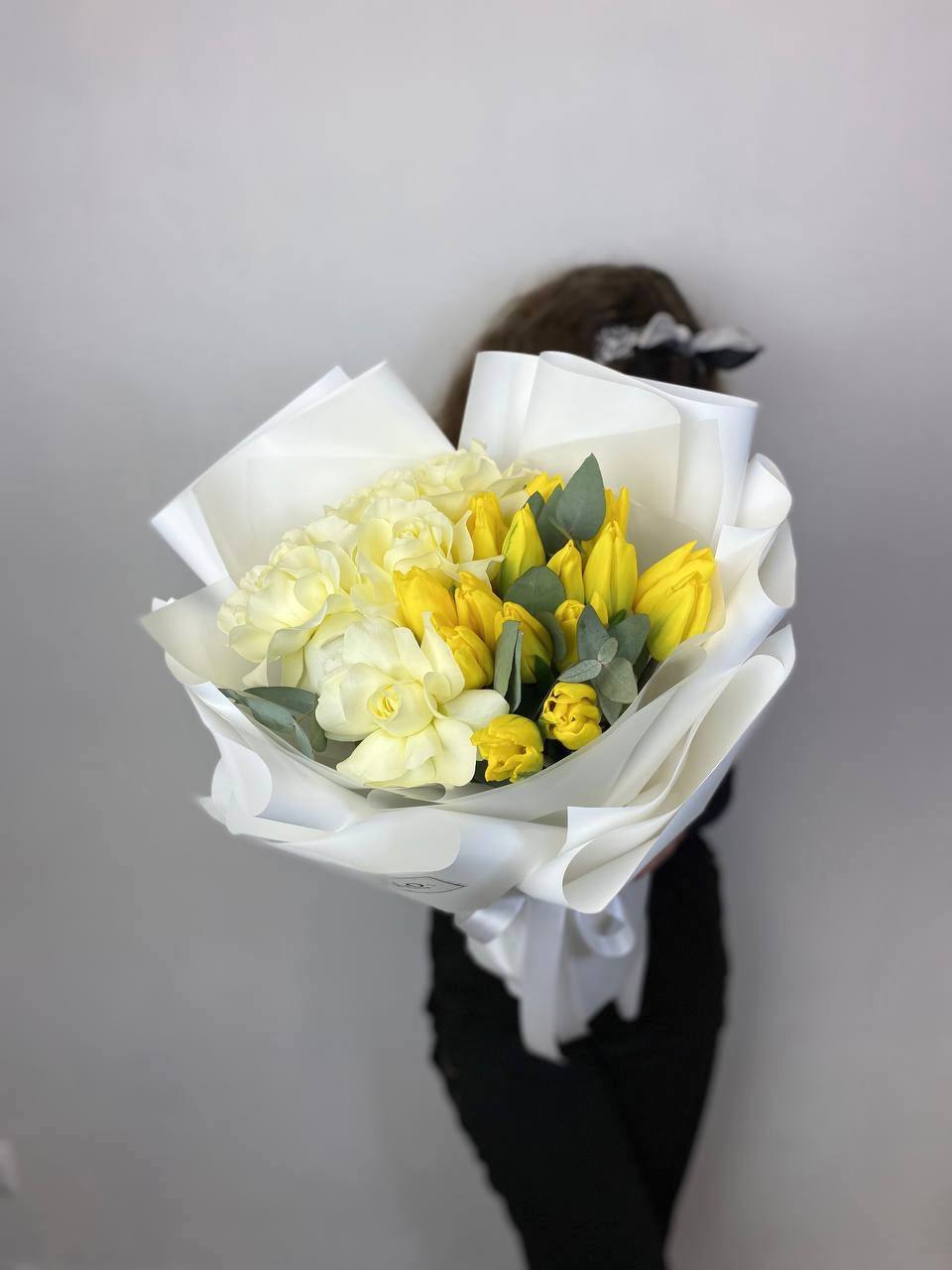 жёлтые тюльпаны, розы, эвкалипт, пленка.