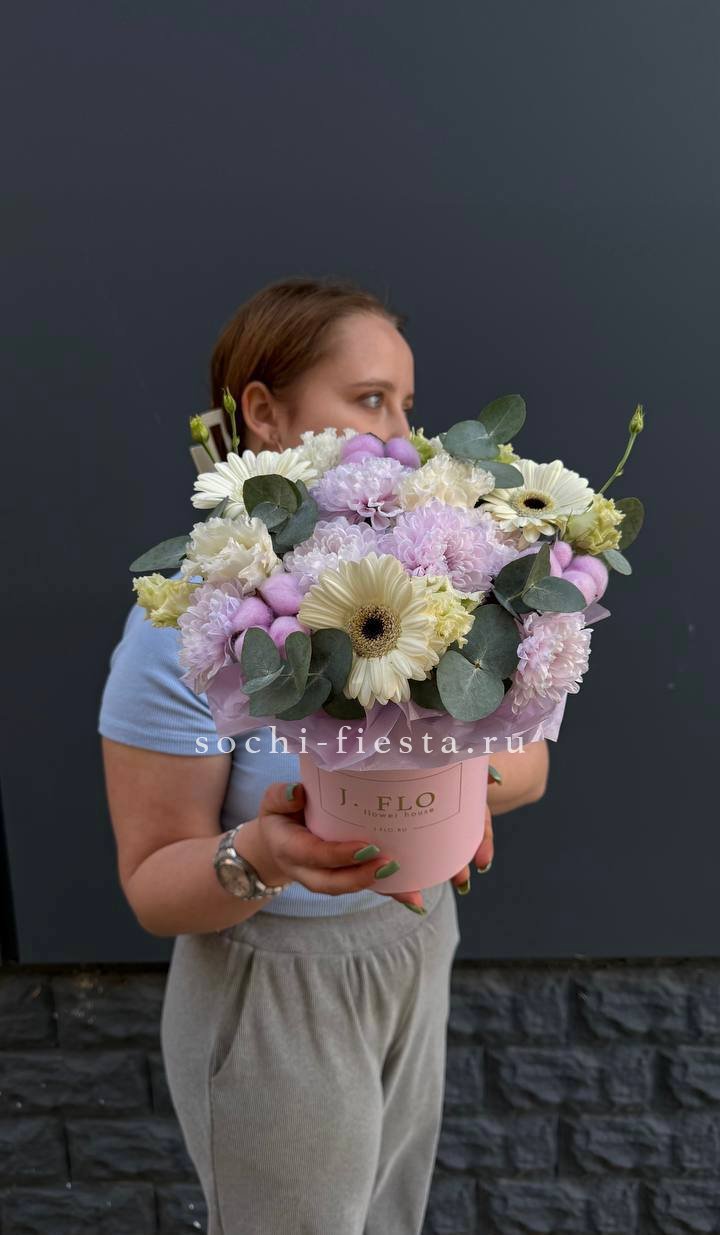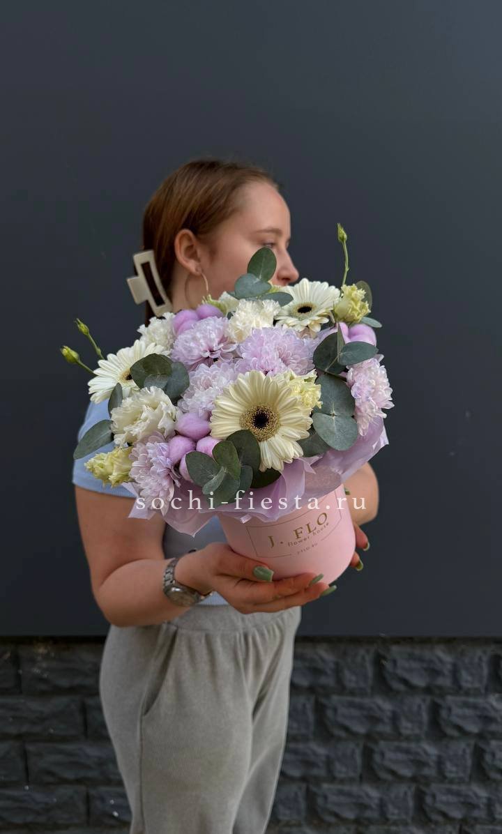 Воздушная гортензия встречается с плотными бутонами французских роз и миниатюрными диантусами. Эустома добавляет объема, а эвкалипт создает свежую основу для всей композиции в цилиндре.