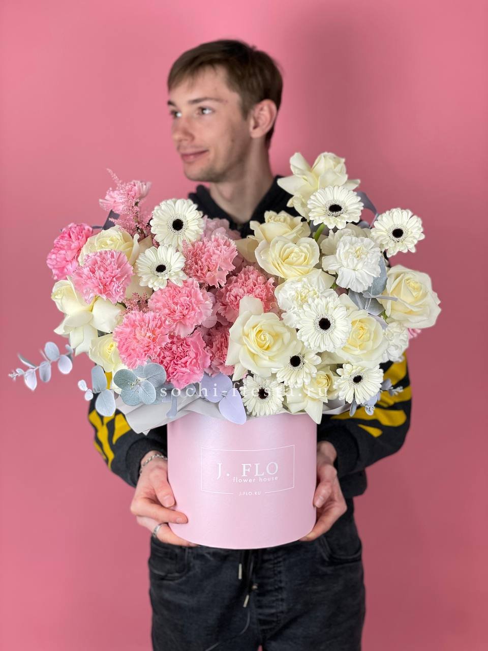 Белоснежные розы и герберы выстраивают чистую цветовую гамму с яркими акцентами диантусов. Эвкалипт вносит графичность и природную фактуру в общую композицию.