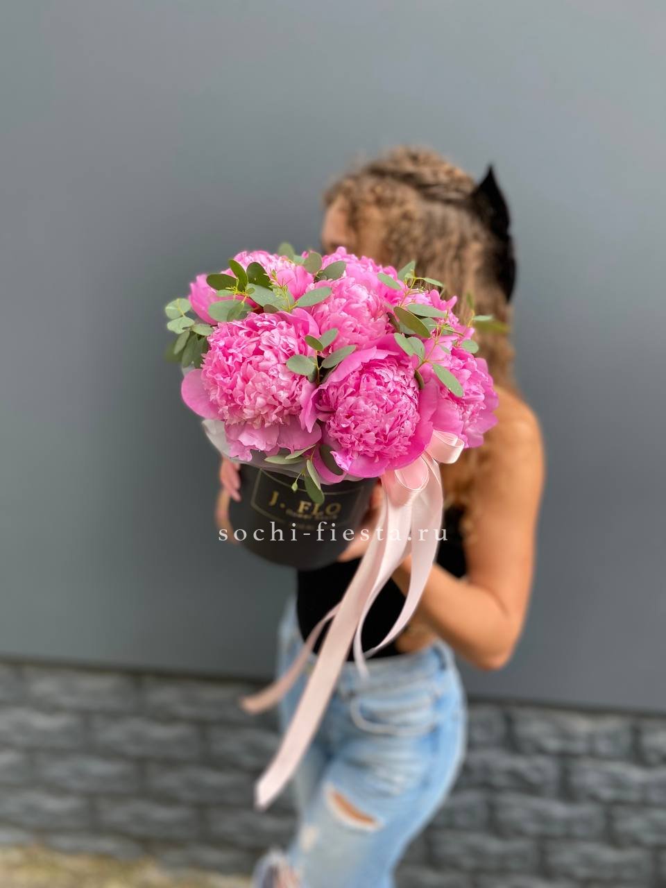 Семь пионов раскрываются пышными шапками в компактном цилиндре. Каждый бутон демонстрирует многослойную структуру лепестков, а эвкалипт обрамляет композицию лёгким серебристым кольцом.