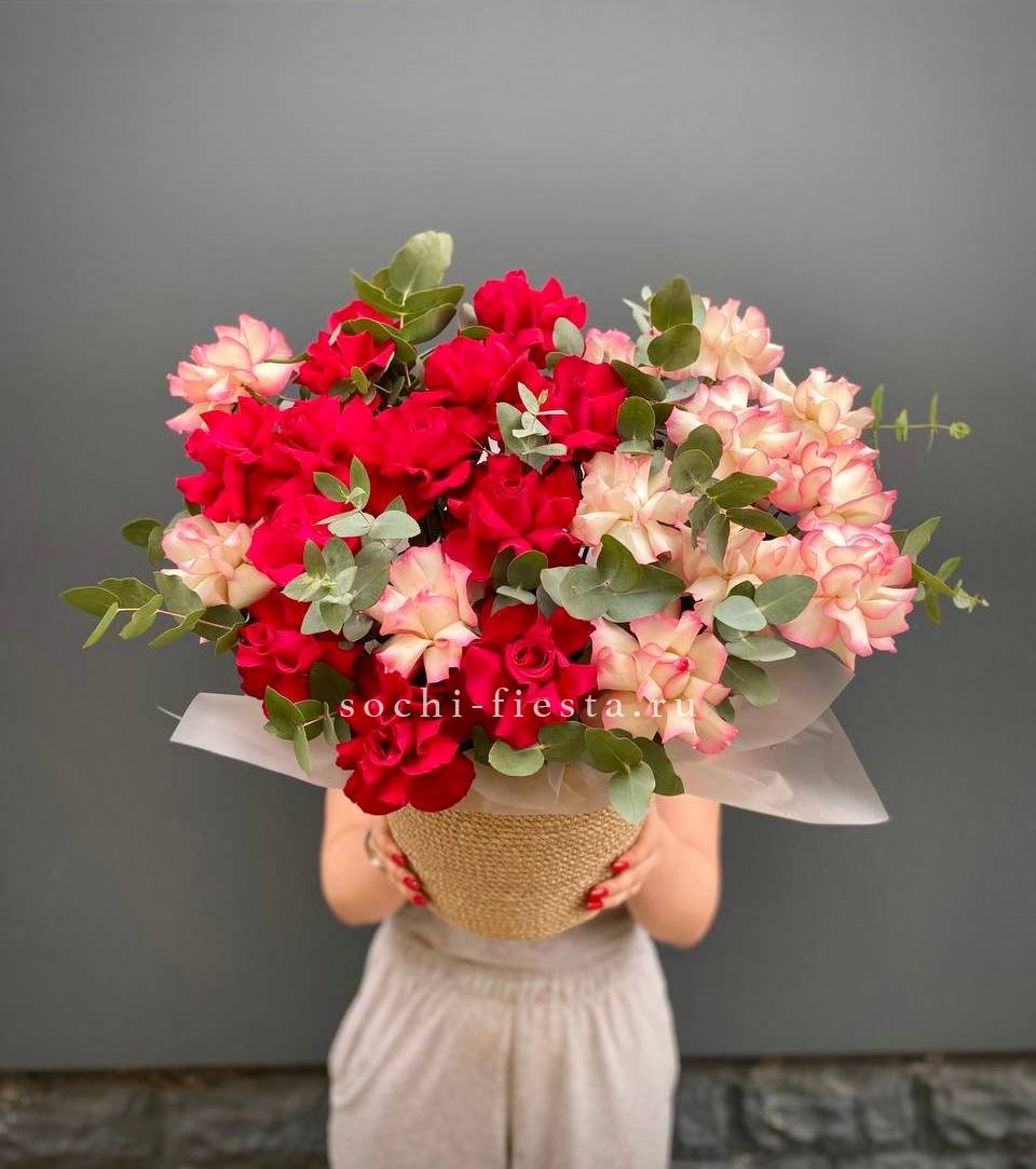 белые и розовые розы, гортензия, эвкалипт в джутовом кашпо.