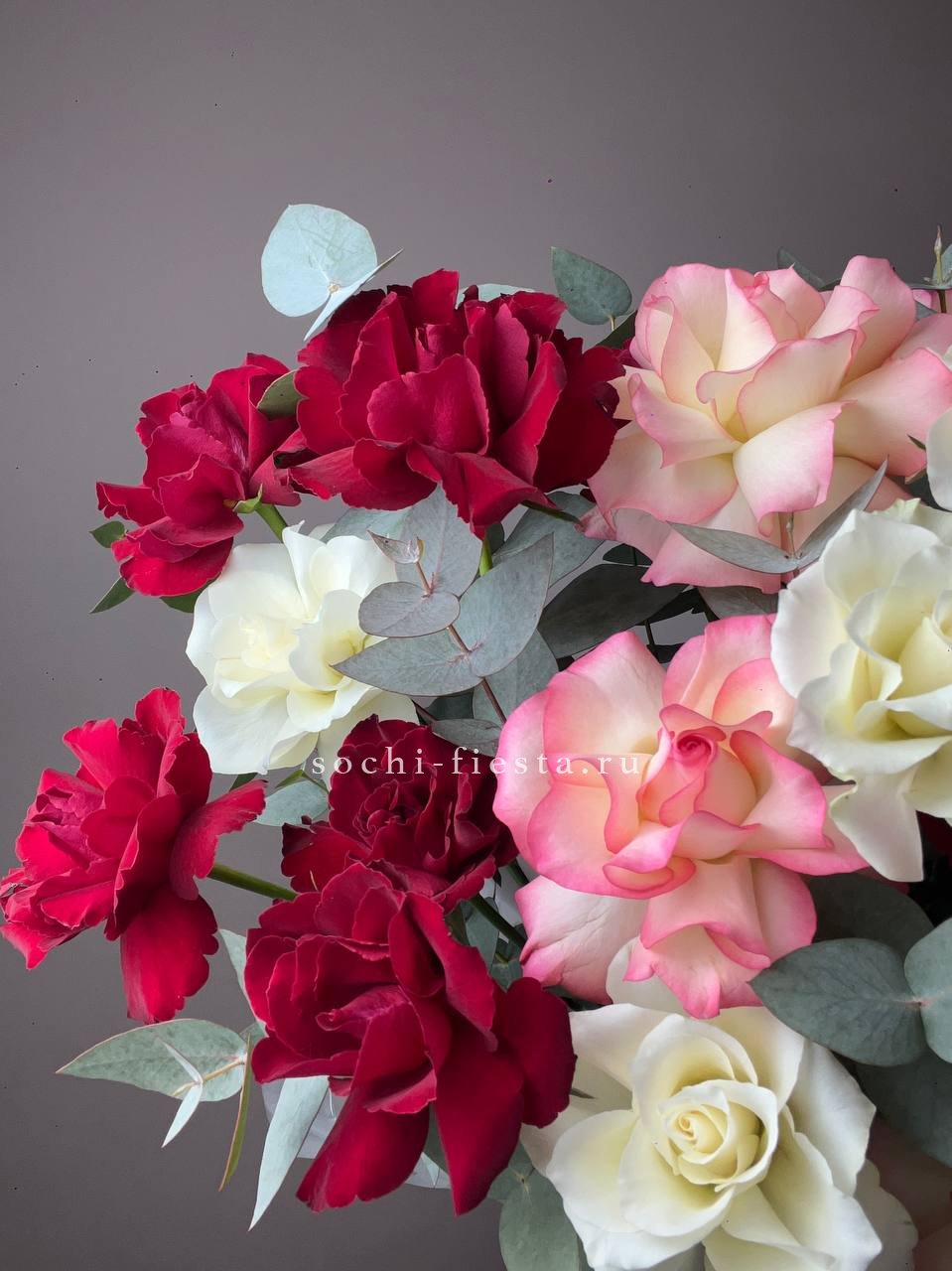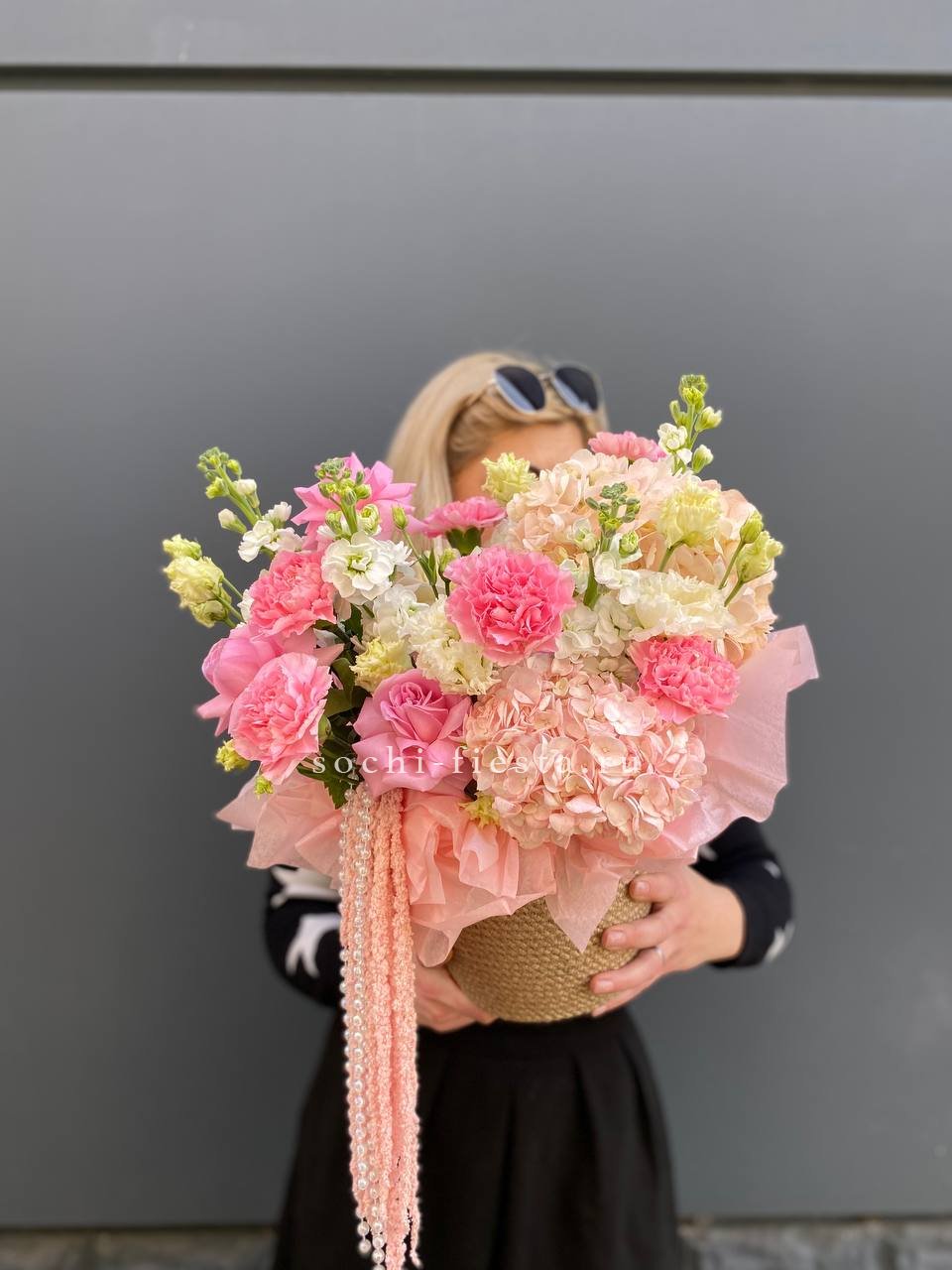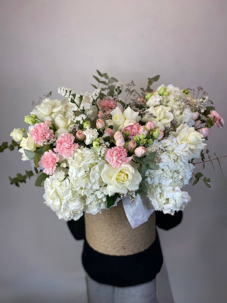 Белоснежные розы и воздушная гортензия создают объёмную композицию с мягкими переходами оттенков. Эустома и диантус добавляют фактурности, а лимониум заполняет пространство между крупными бутонами.