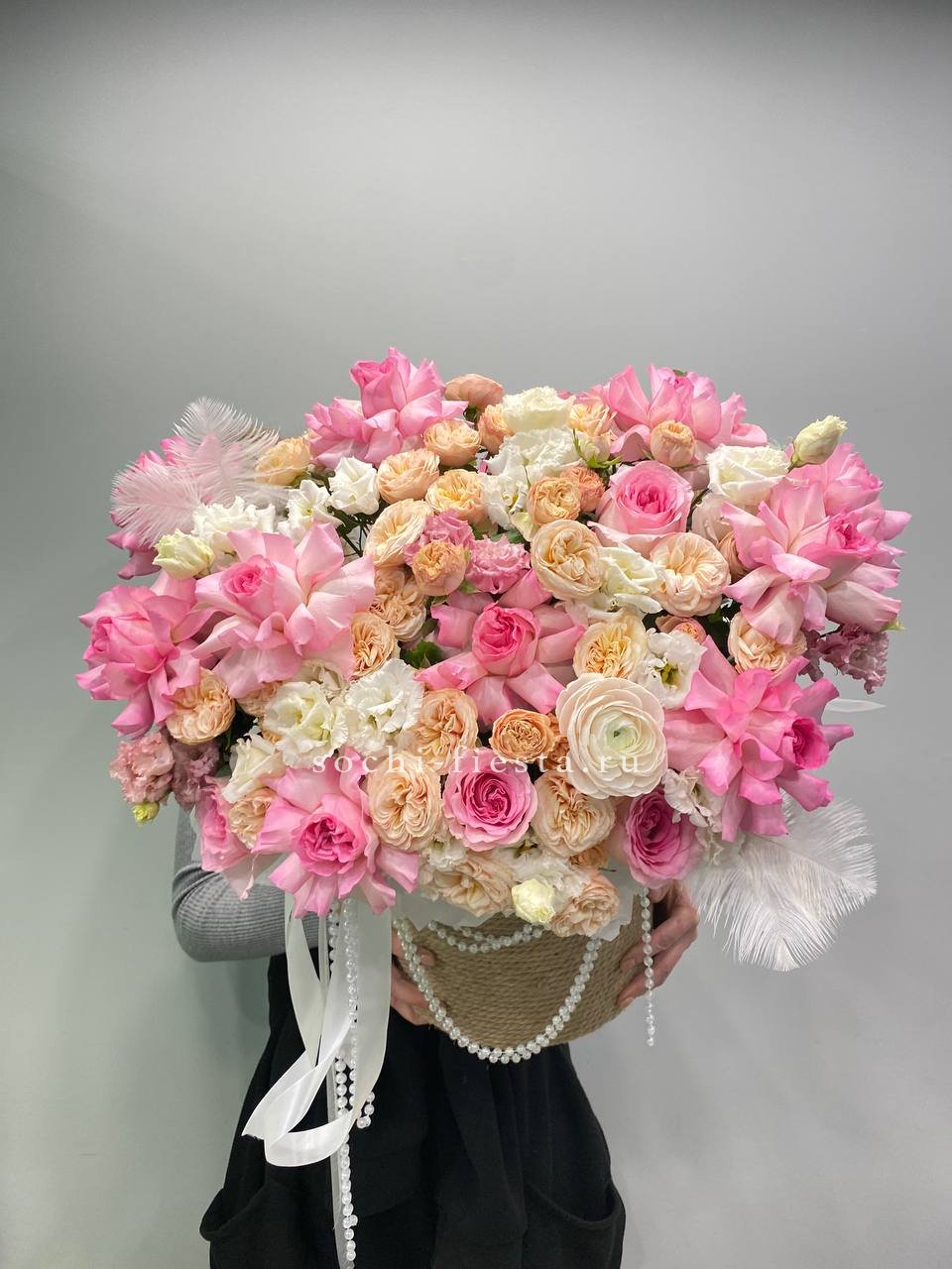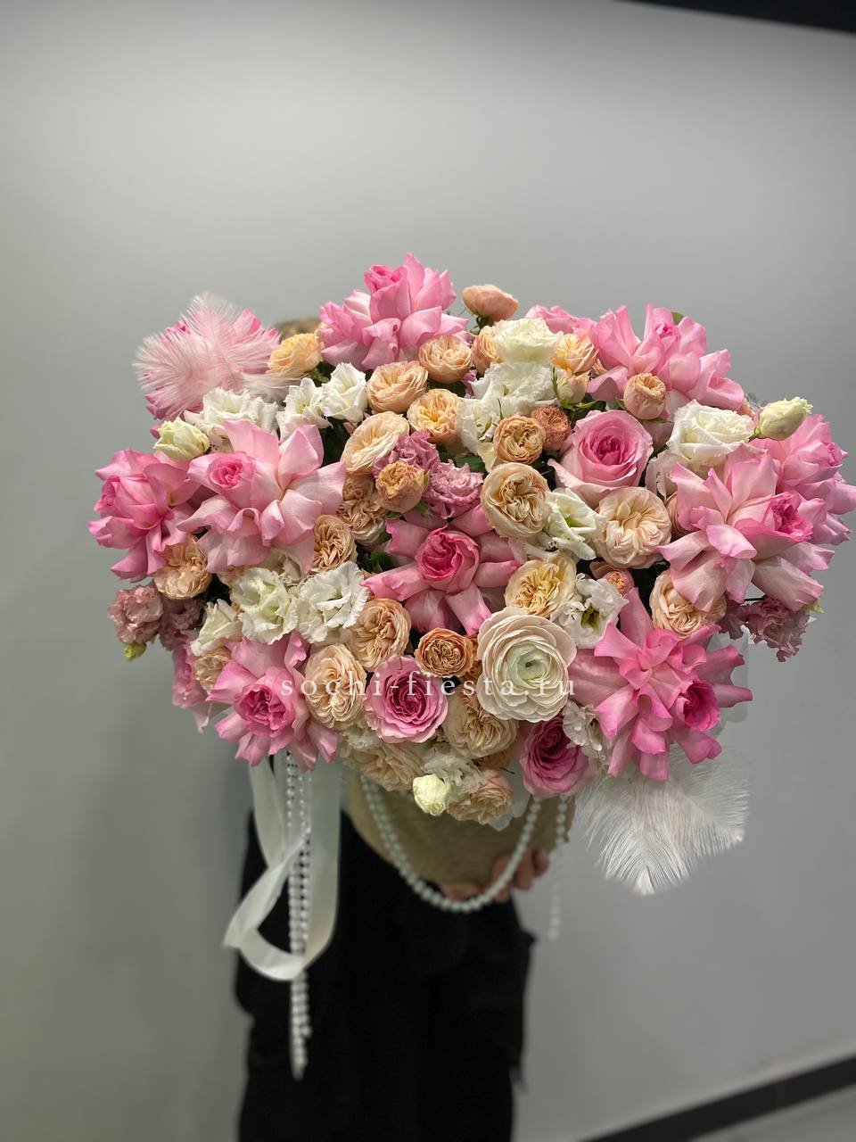 Розовые розы и пионовидные кустовые создают пышный объем, дополненный ранункулюсами и эустомой. Декоративные бусы и перья придают композиции театральность, словно застывший момент балетного выступления.