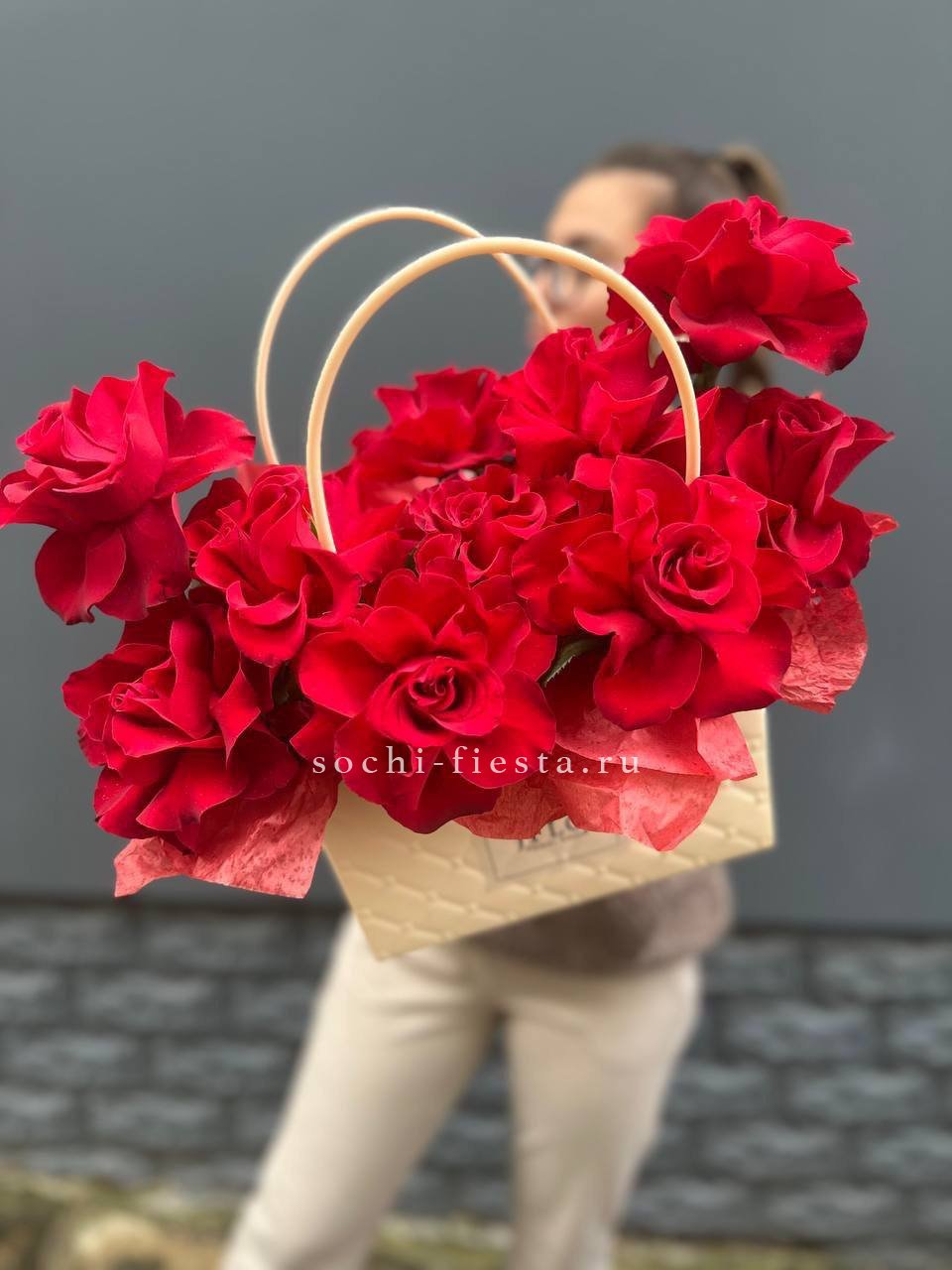 Гортензии задают плотную основу, герберы и диантусы вносят ритм, а альстромерии с эустомой создают движение вверх. Разнообразие форм и оттенков выстраивает многослойную картину в одной сумке.