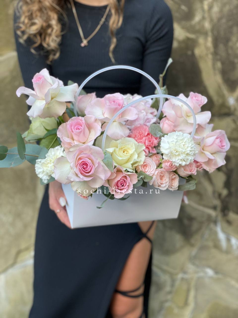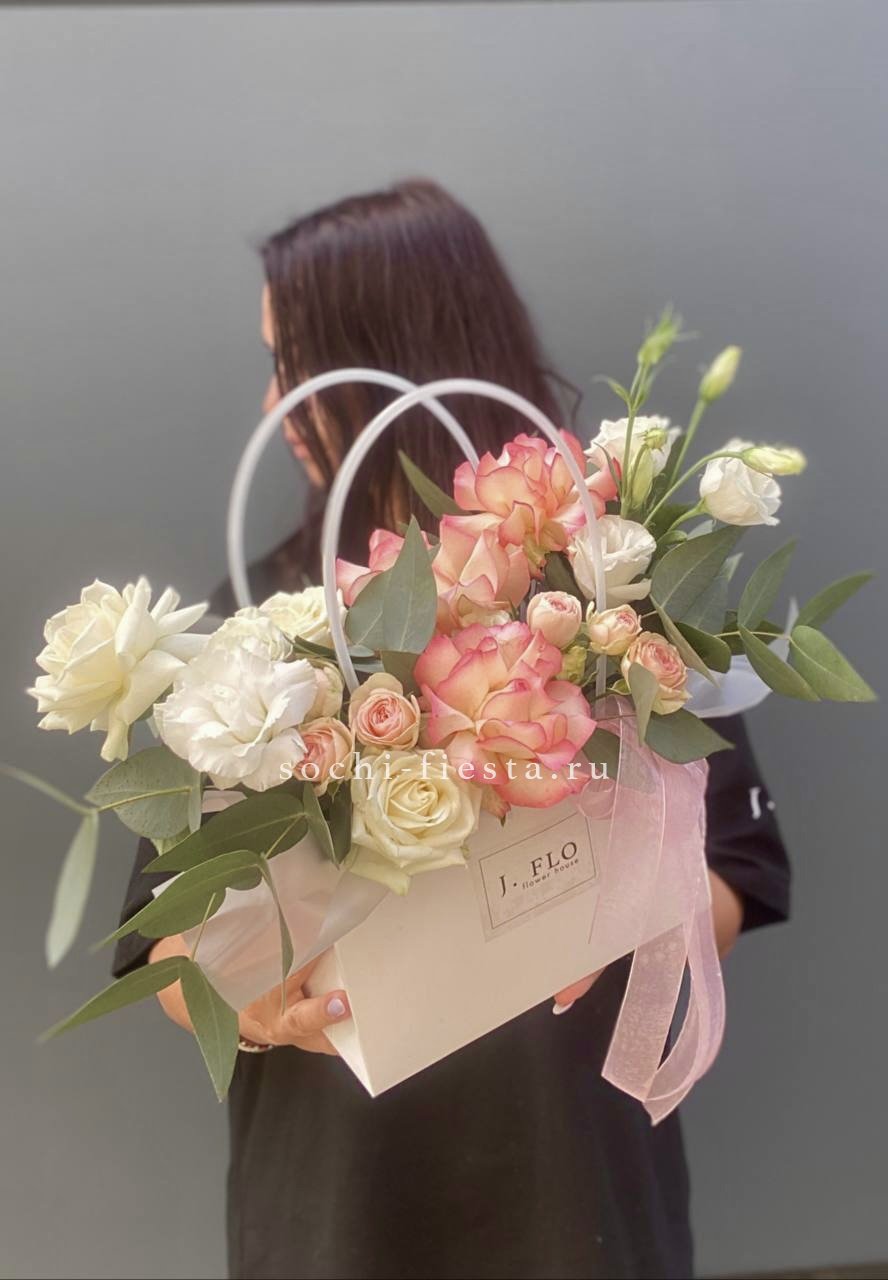 Сумочка Florence дарит ощущение солнечного утра. Альстромерии и розовые розы собраны в легкую композицию с добавлением хлопка и диантусов. Удобная форма позволяет разместить её на столе или подоконнике.