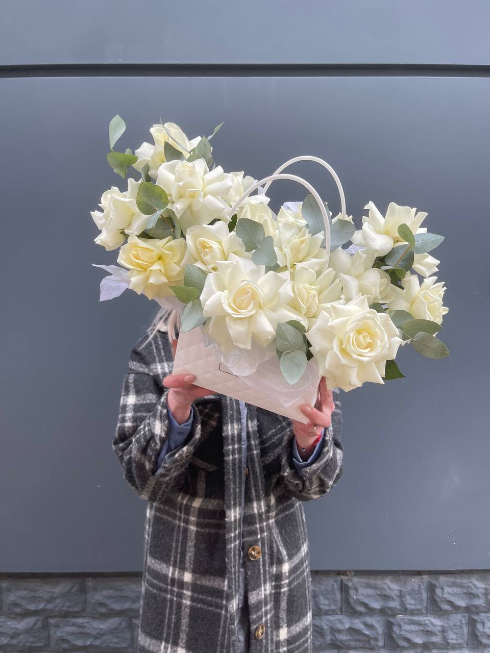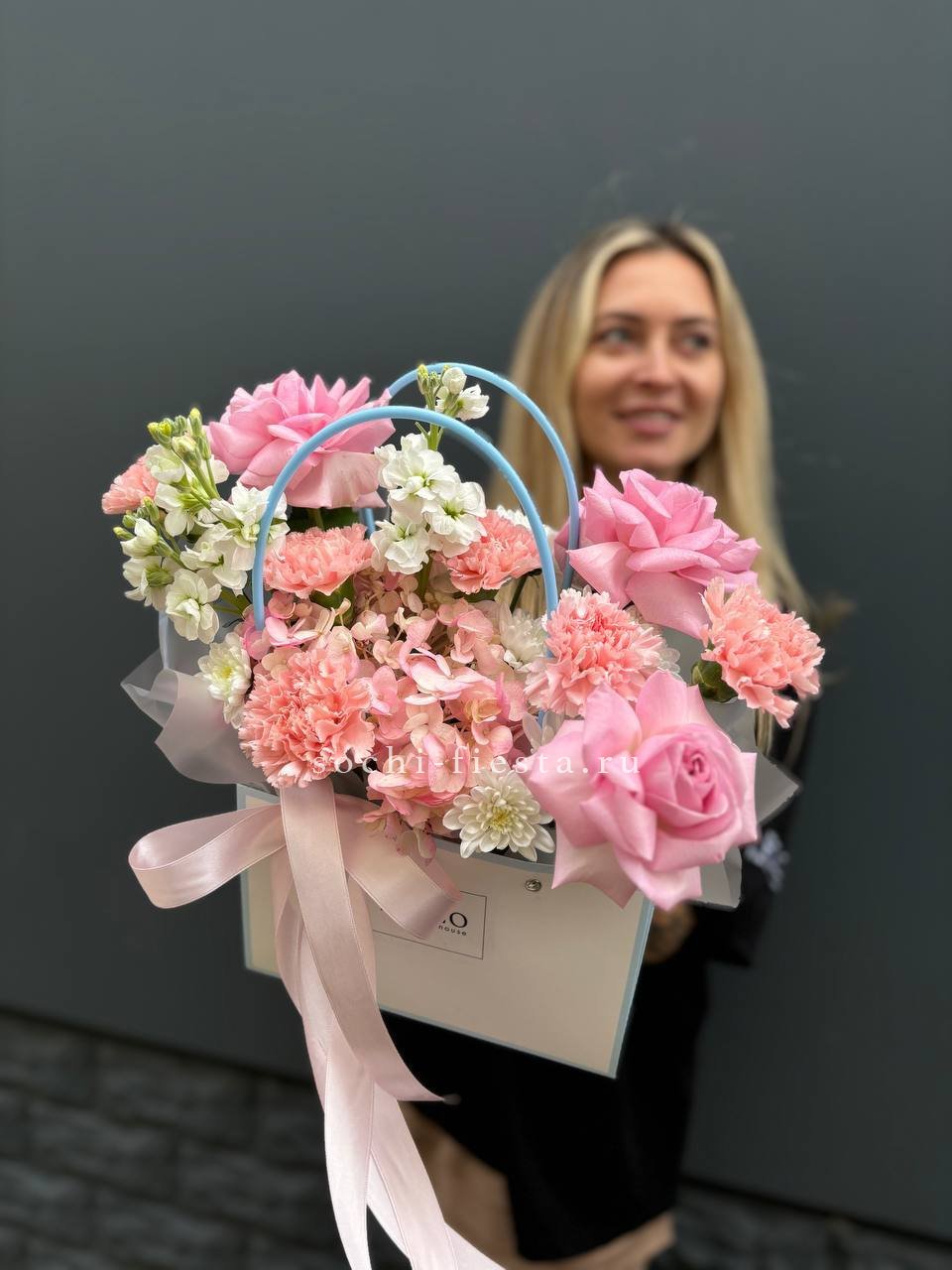 гортензия, розы, эустома, эвкалипт, диантус, лента, сумка.