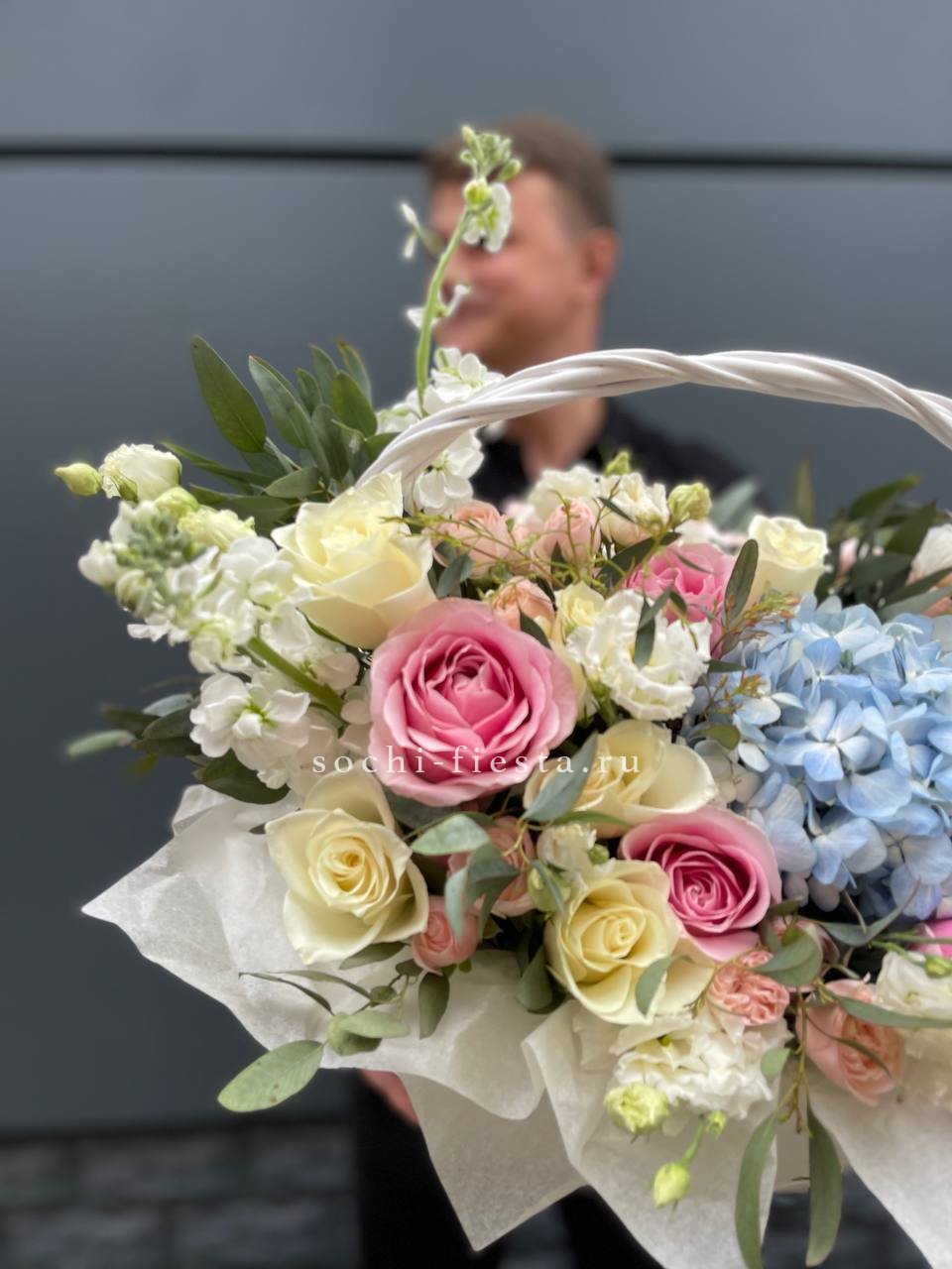 гортензия, эустома, розы, маттиола (дельфиниум или аналоги), кустовые розы, лента, корзина D40