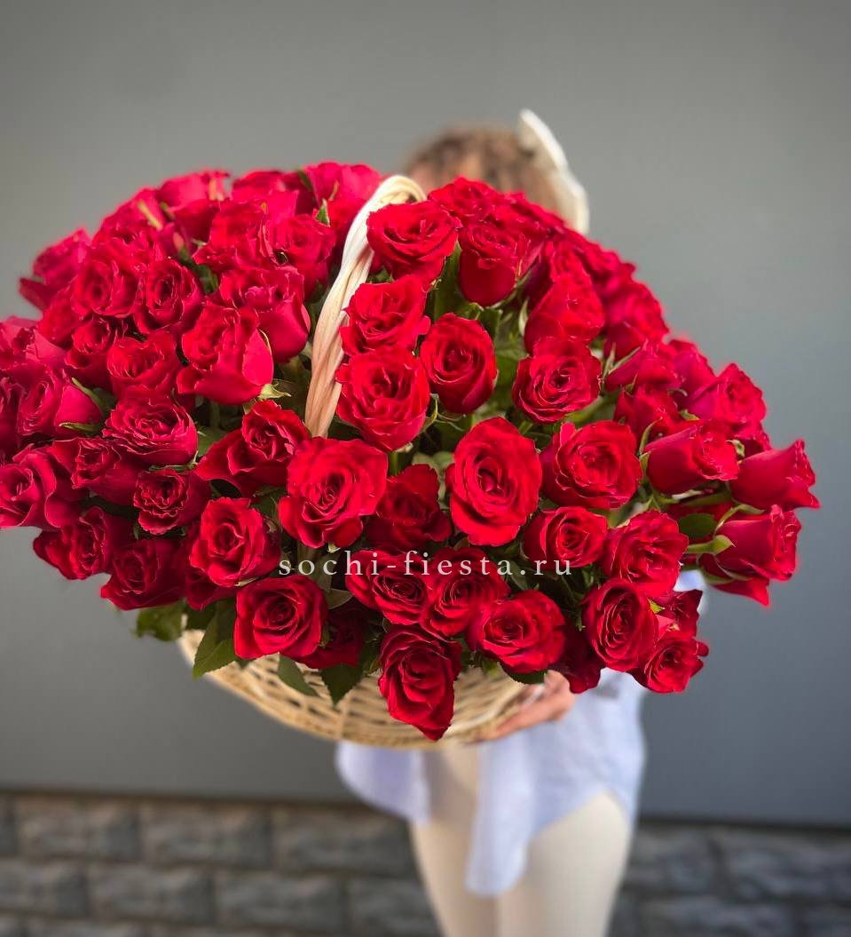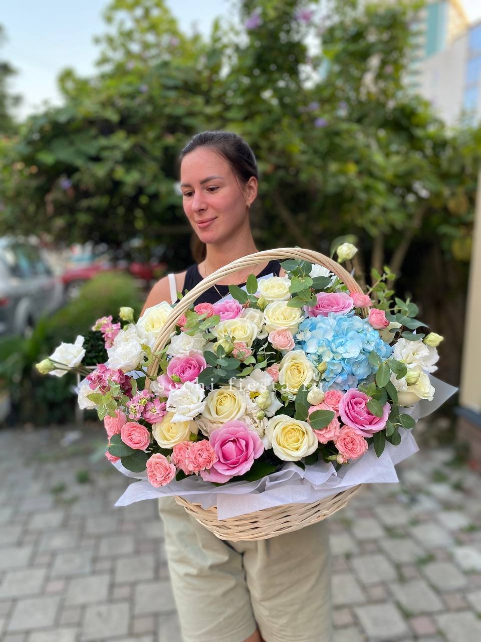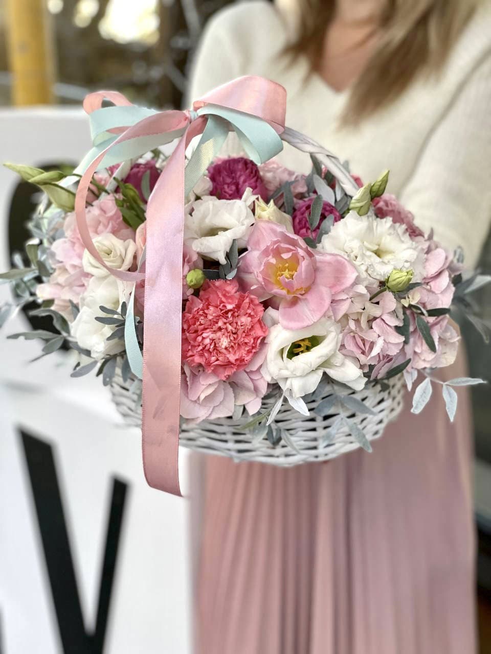 розы, эустома, гортензия, бомбастик, маттиола ( или аналог), эвкалипт, корзина.