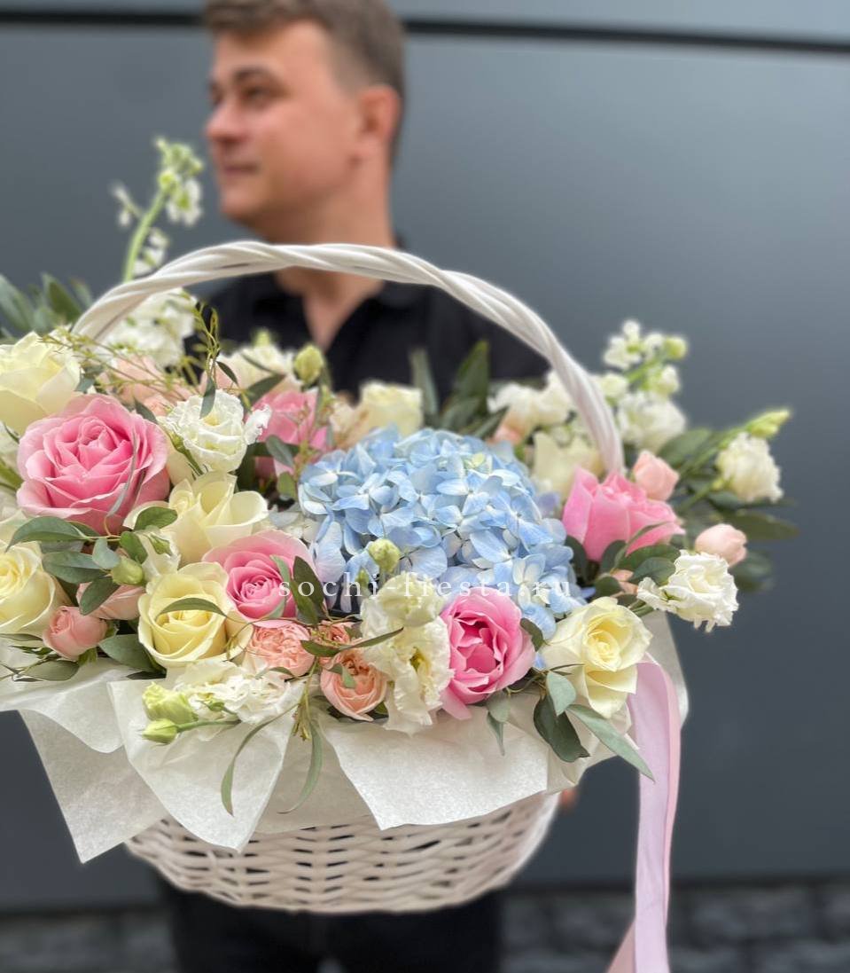 орхидея, гортензия, эустома, роза, эвкалипт, альстромерия, лента, корзина.