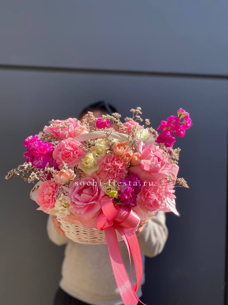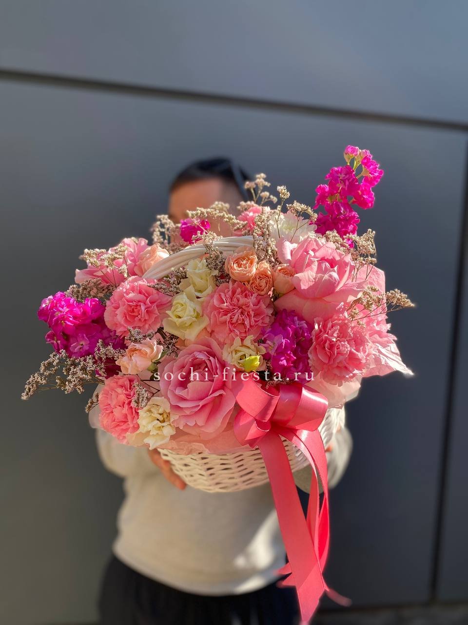 Пышная корзина объединяет пионовидные розы с воздушной гортензией и многослойной эустомой. Матиолла и лимониум добавляют глубину композиции, а диантус создает мягкие переходы между крупными бутонами.