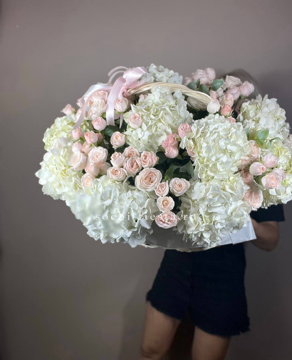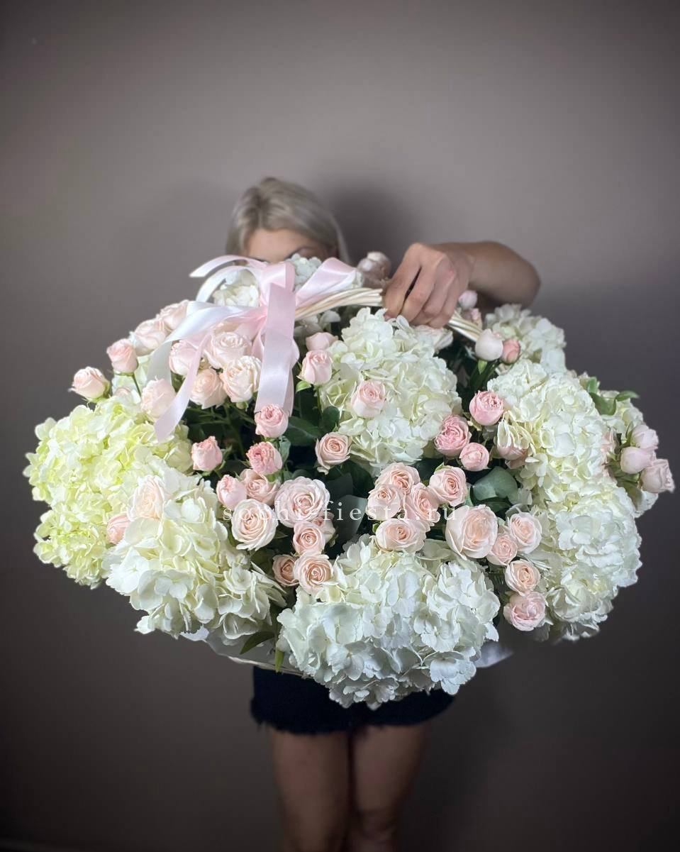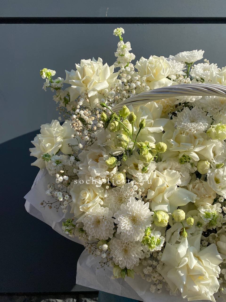 Белые розы и эустома образуют воздушную композицию с мягкими переходами между соцветиями. Хризантемы и маттиола добавляют объема, а гипсофила создает легкую дымку по краям. Корзина выглядит свежо и собранно в любом пространстве.