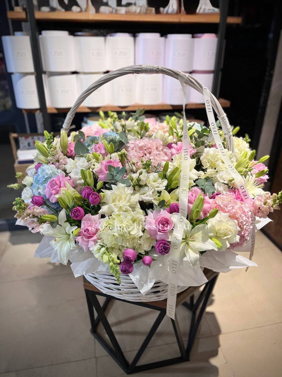 Масштабная корзина объединяет лилии, гортензии, антиринум, розы и эустому в единую объёмную композицию. Высота и насыщенность каждого слоя создают впечатление цветочного изобилия.