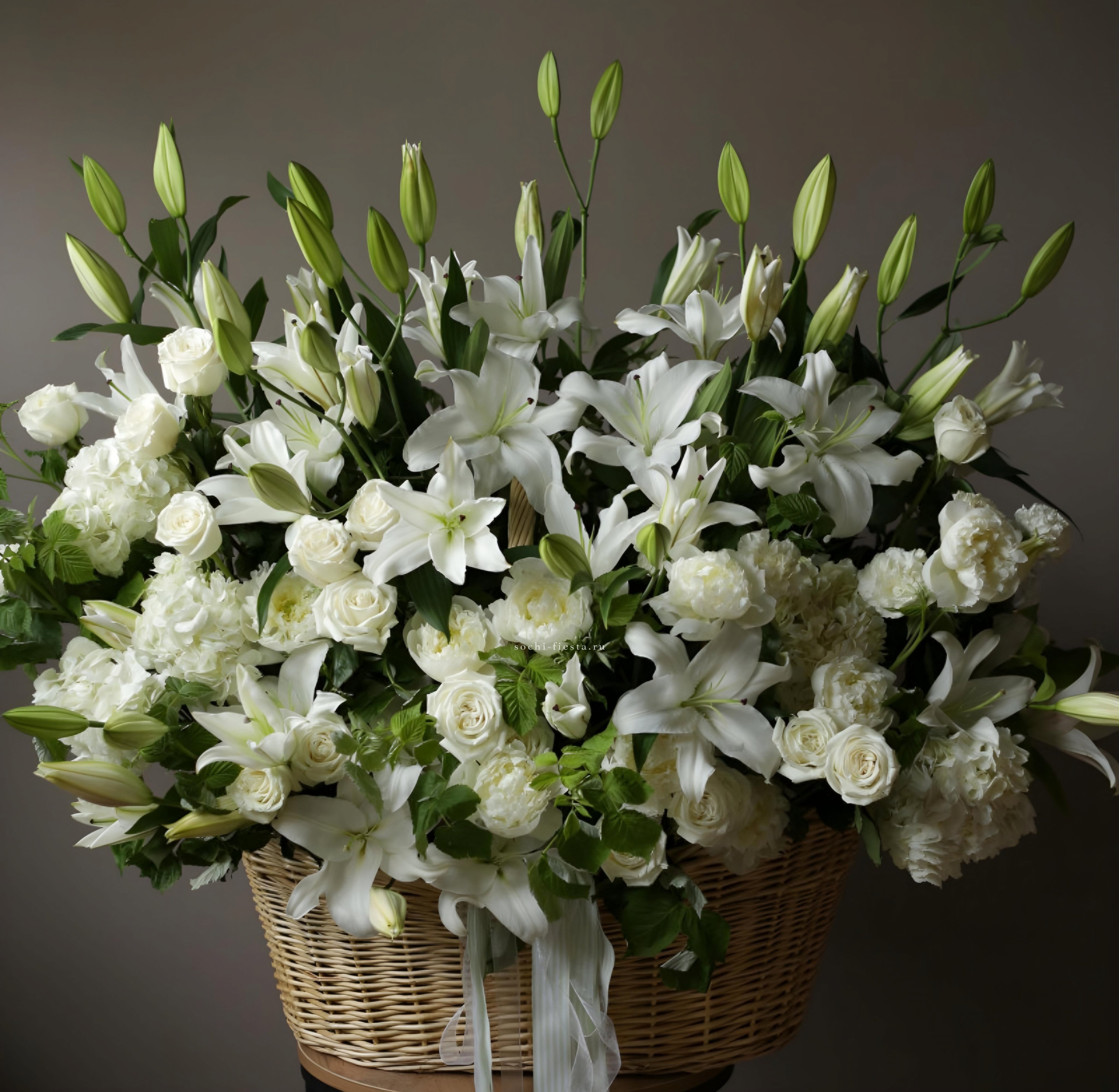 Гортензия и эустома задают объём, а яркие герберы расставляют цветовые акценты по всей композиции. Диантус и хайди добавляют воздушности, эвкалипт завершает силуэт мягкими линиями. Корзина держит форму и создаёт устойчивую основу для пышной композиции.
