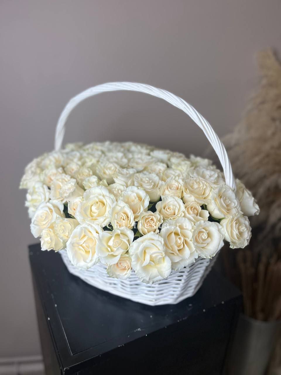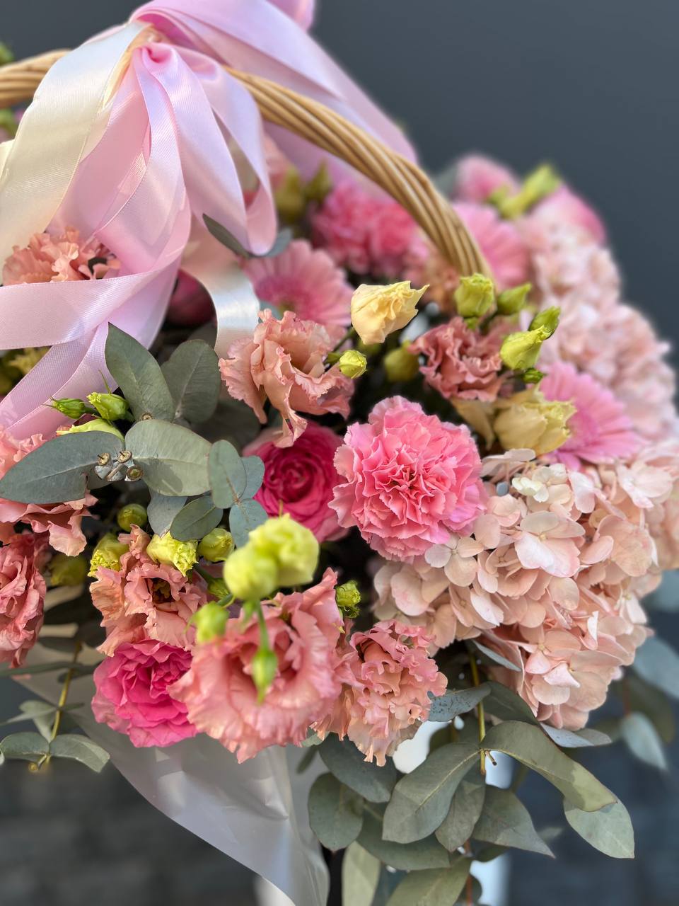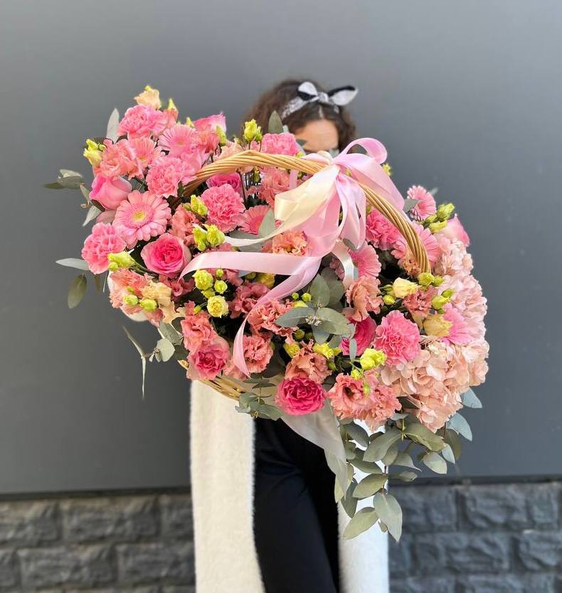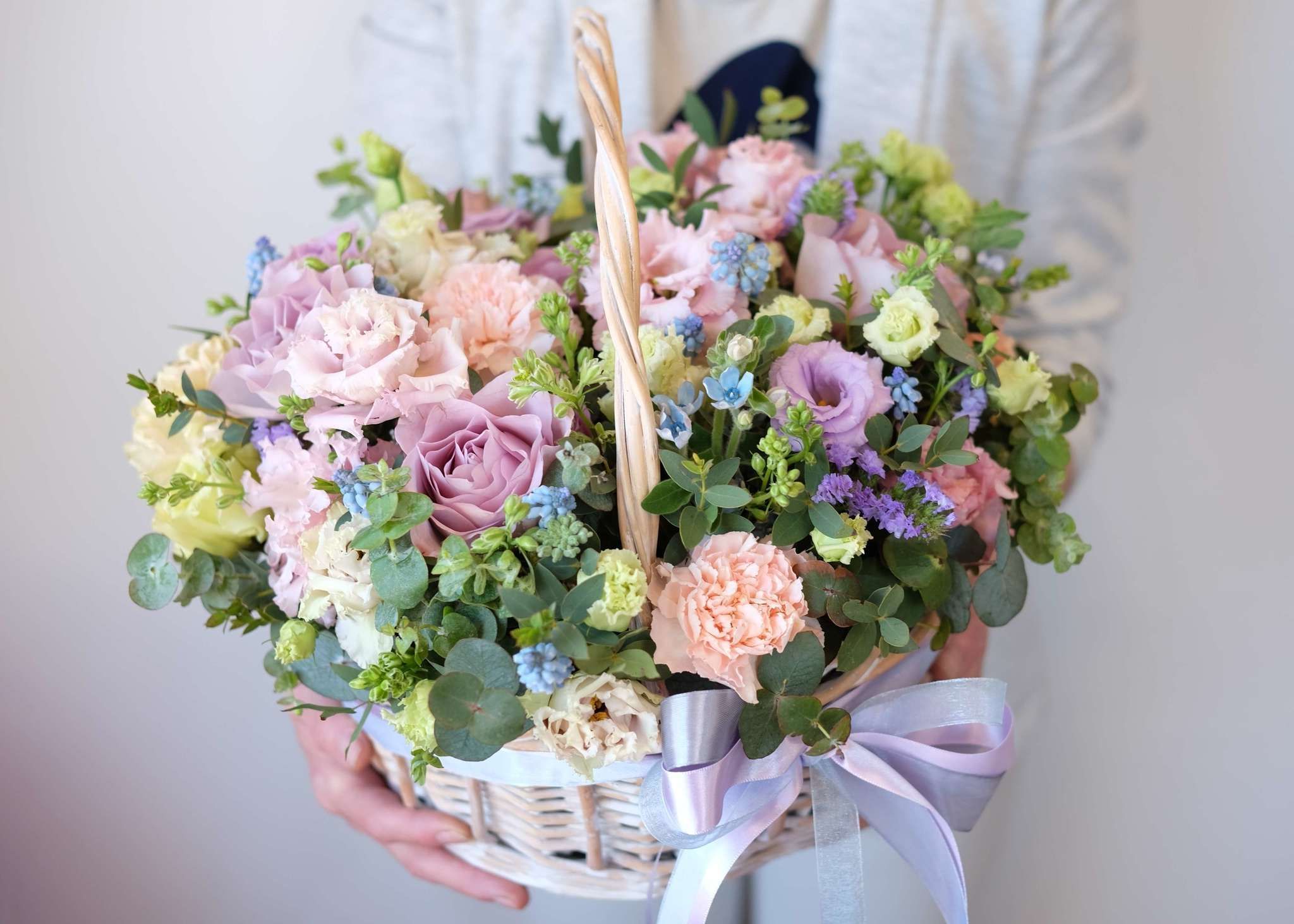 Плотная россыпь кустовых роз и эустомы создает живую текстуру с множеством мелких бутонов. Диантус добавляет воздушности, а эвкалипт собирает композицию в завершенную форму. Корзина позволяет разместить букет на столе без дополнительной вазы.