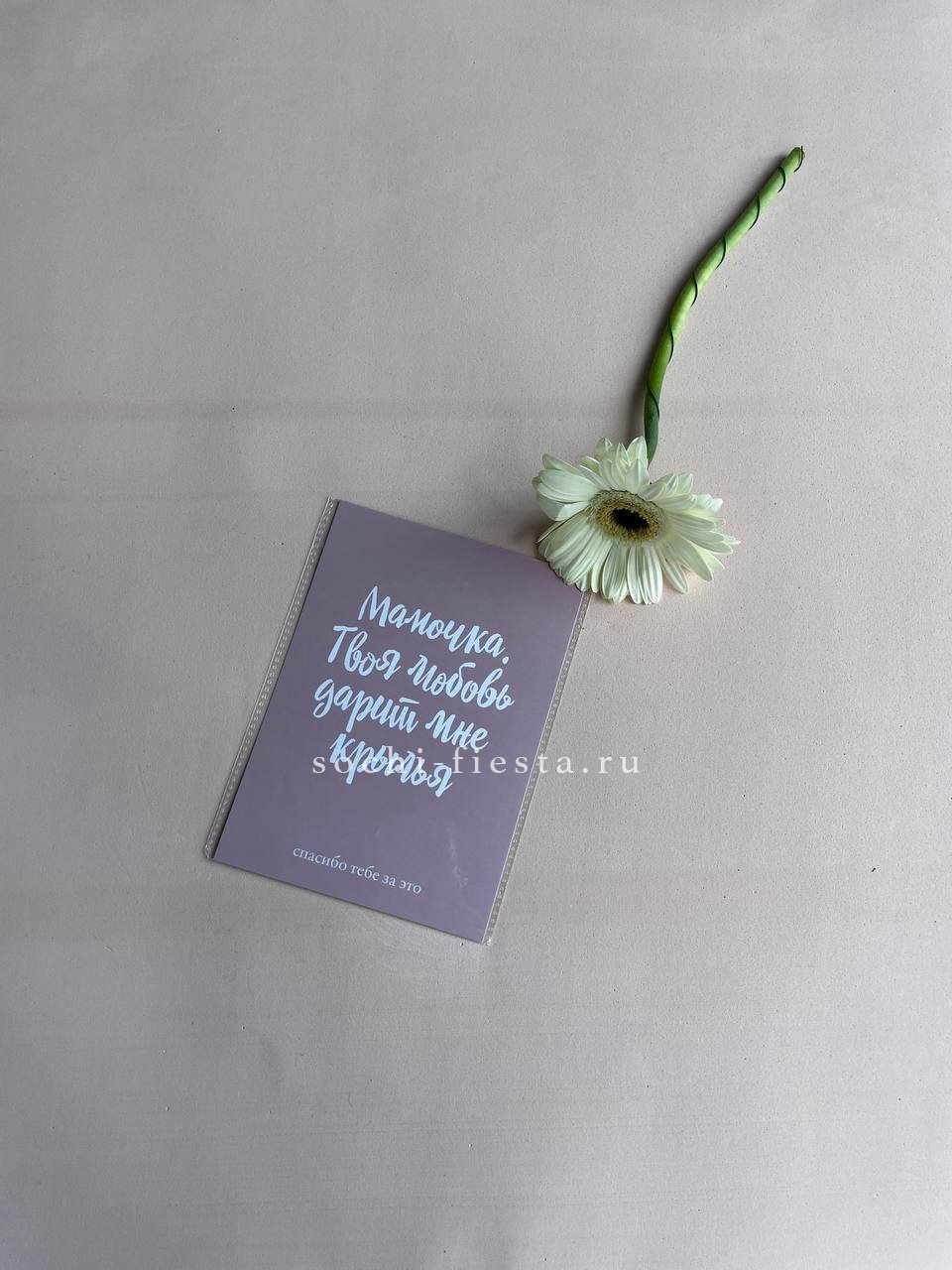 Открытка с теплой надписью и местом для личного послания. Ваш текст будет вписан от руки каллиграфическим почерком. Приятное дополнение к букету для выражения чувств.