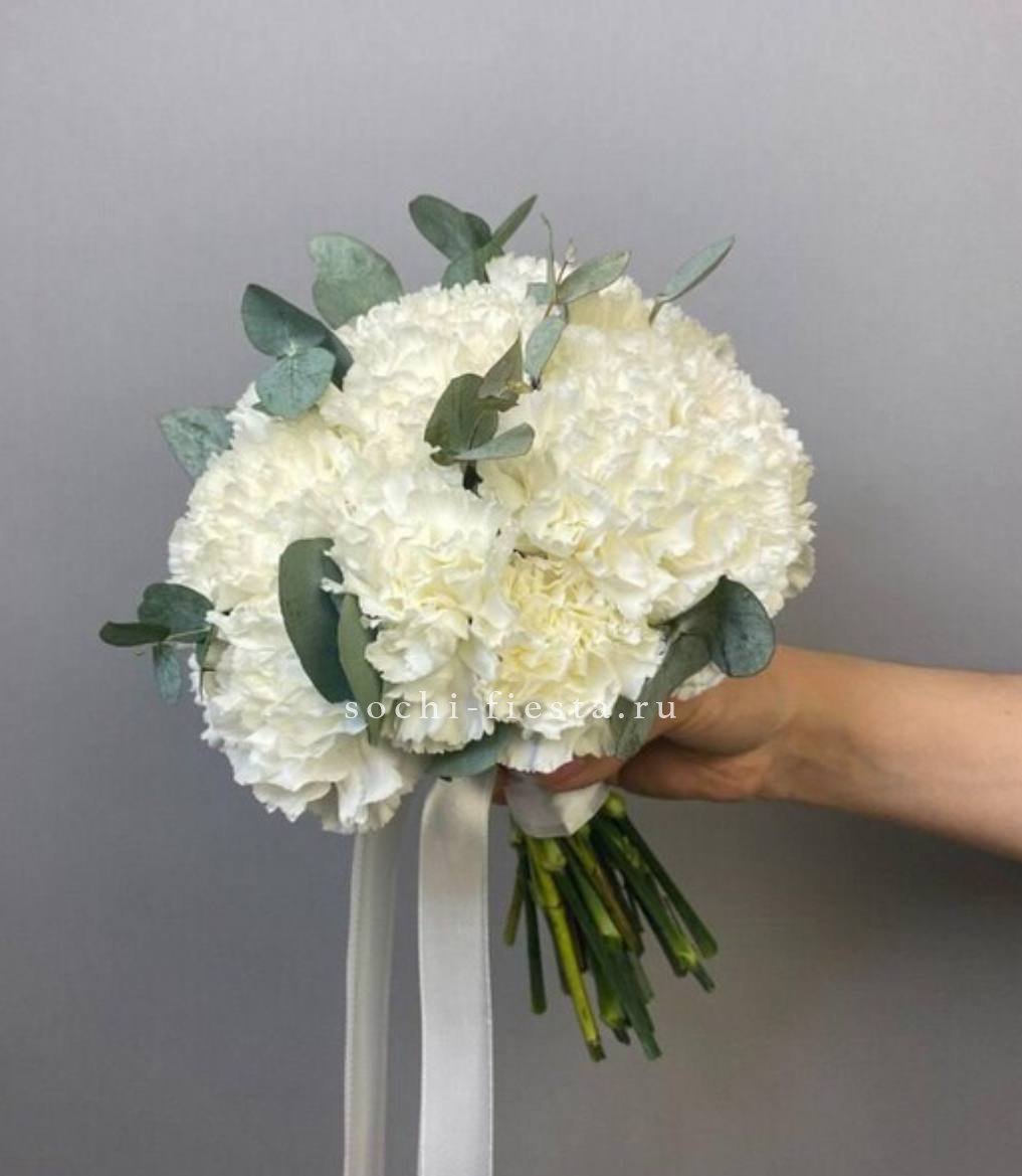 Белоснежная композиция с махровыми соцветиями эустомы и классическими розами. Сезонные детали и зелень образуют естественный рисунок без лишней строгости.
