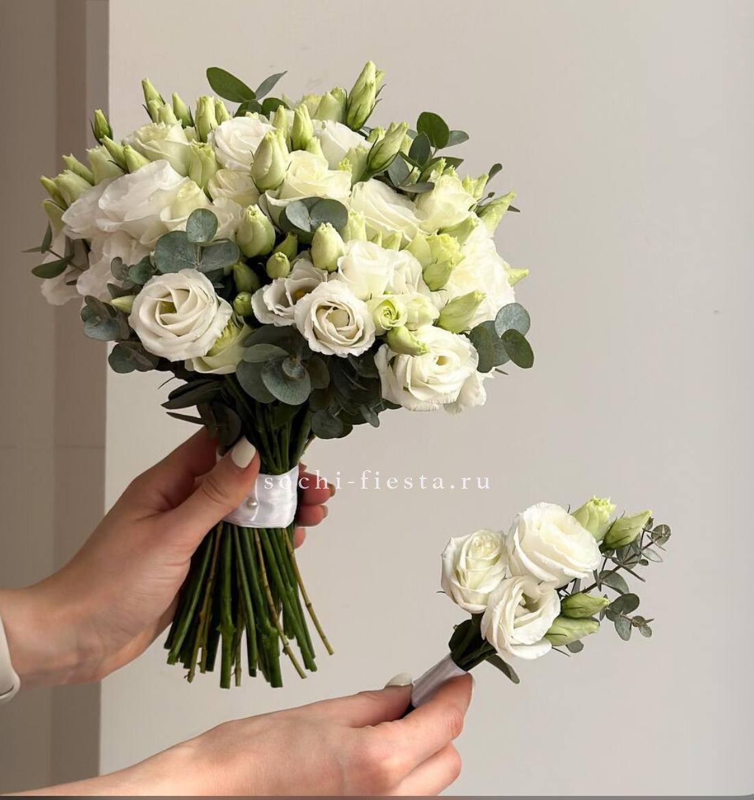 эустома, одноголовые розы, сопутствующие элементы (мелкие цветы или бруния в зависимости от сезона), эвкалипт, лента.