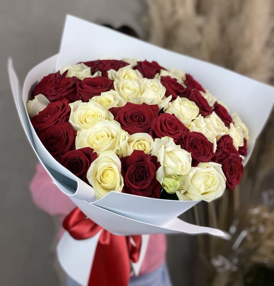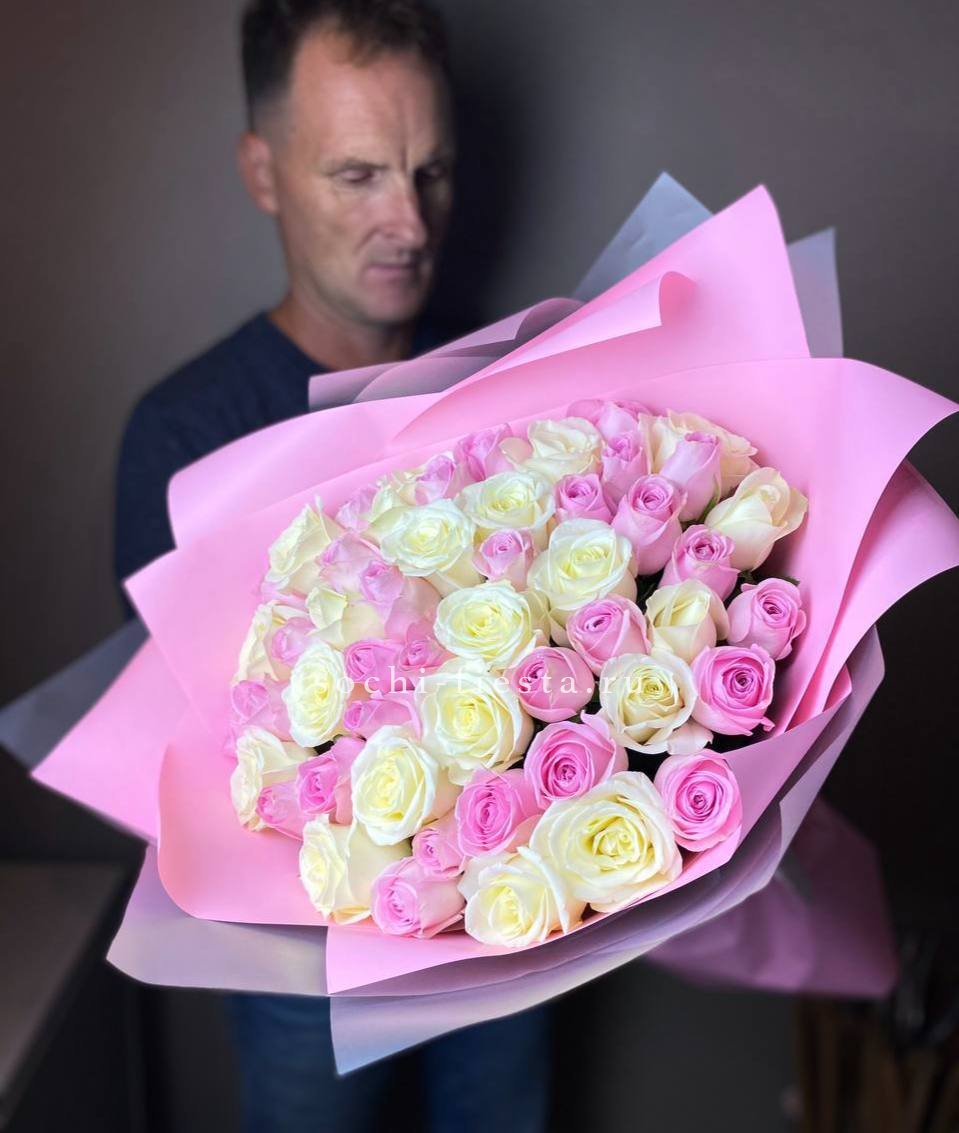 Мягкая игра оттенков между белым и розовым создает объемную глубину букета. Пятьдесят один бутон выстраивается в плотную структуру, где каждый цвет усиливает звучание соседнего без резких границ.