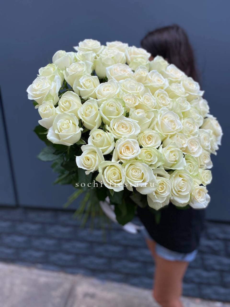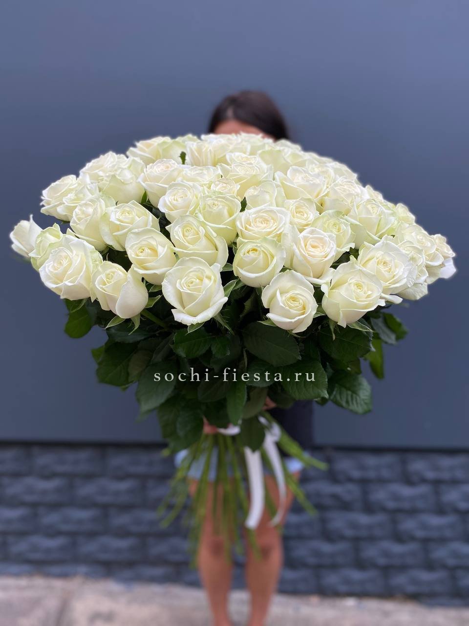 Двадцать пять белых роз образуют объёмную композицию с выразительным силуэтом. Плотная сборка и ритмичное расположение бутонов создают графичное впечатление.