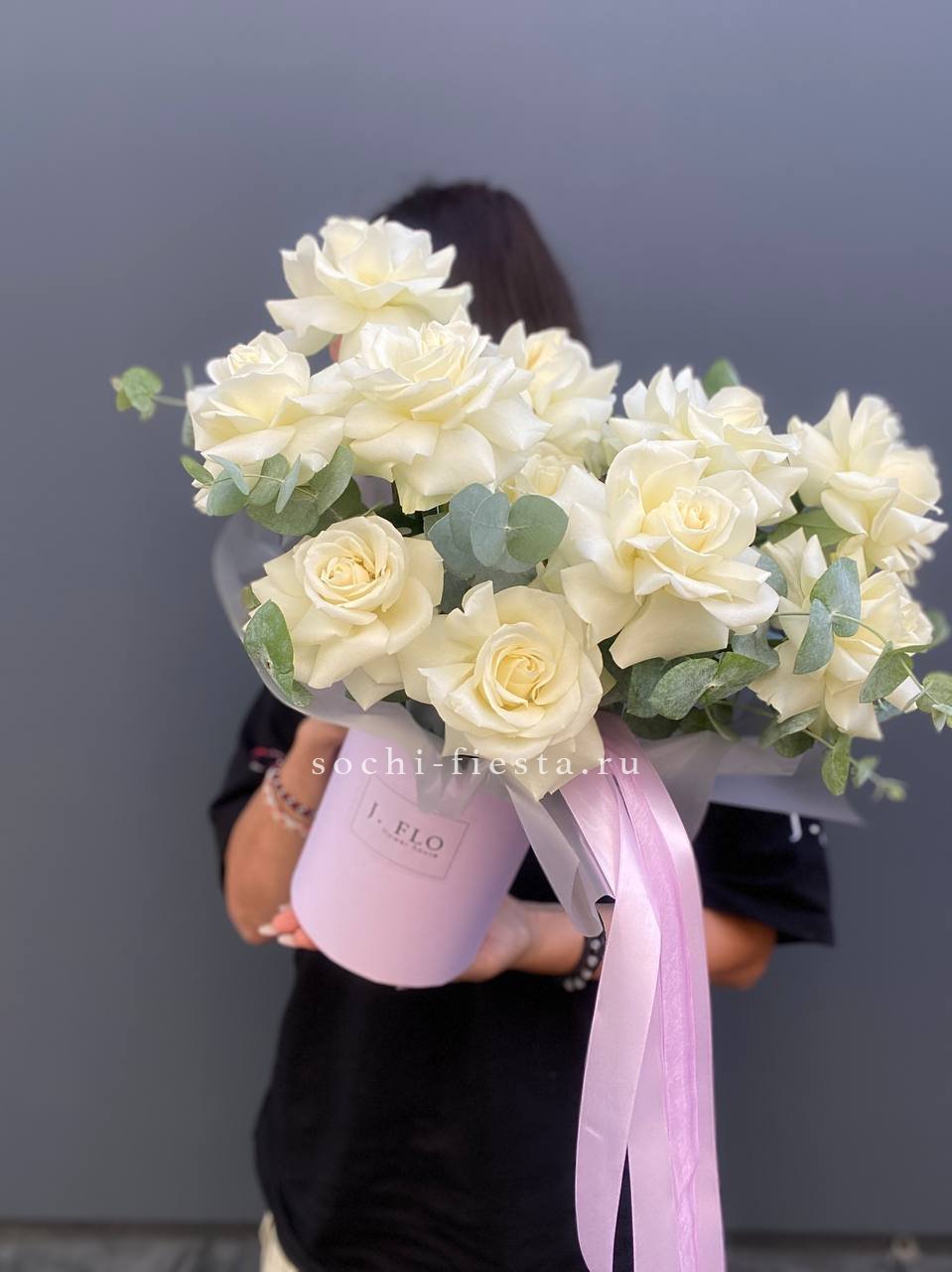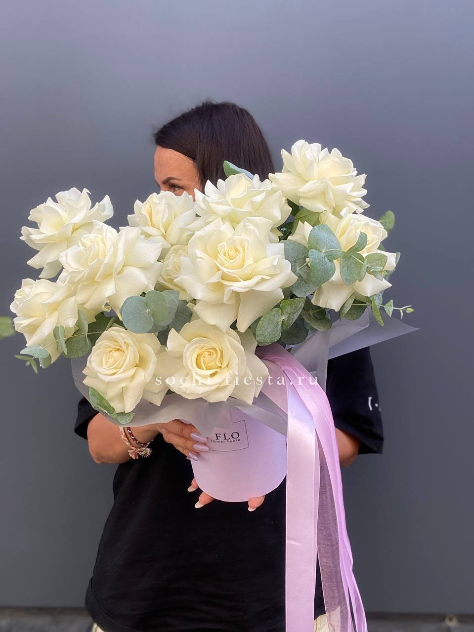 Тридцать пять белых бутонов образуют плотный монохромный ансамбль. Классическая форма и чистота оттенка позволяют букету звучать самодостаточно в любом интерьере.