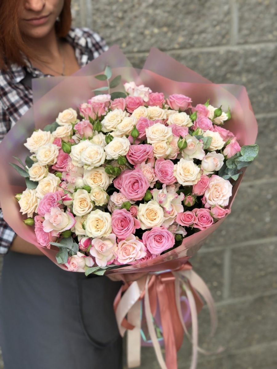 кустовые розы, лента, дизайнерская пленка.