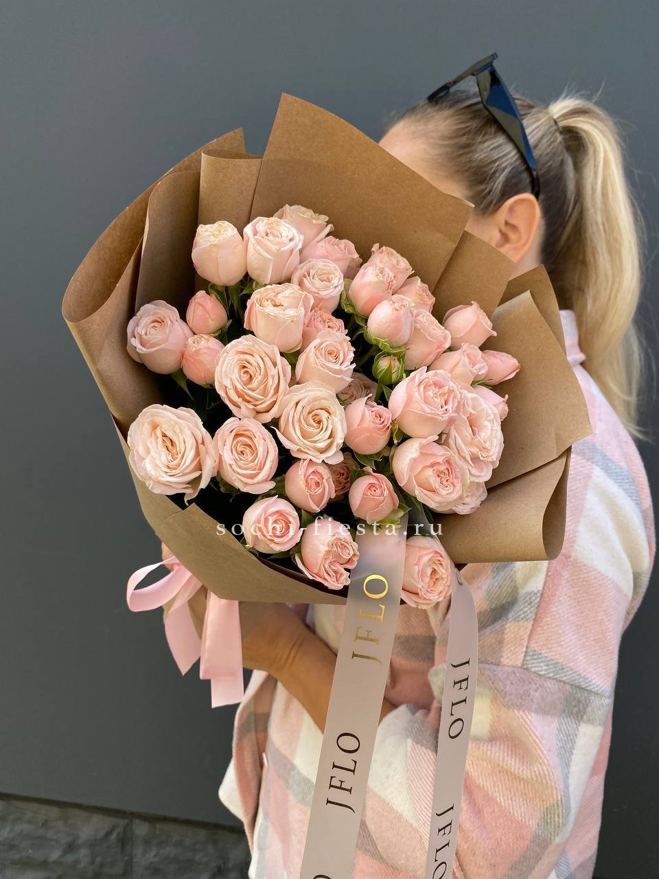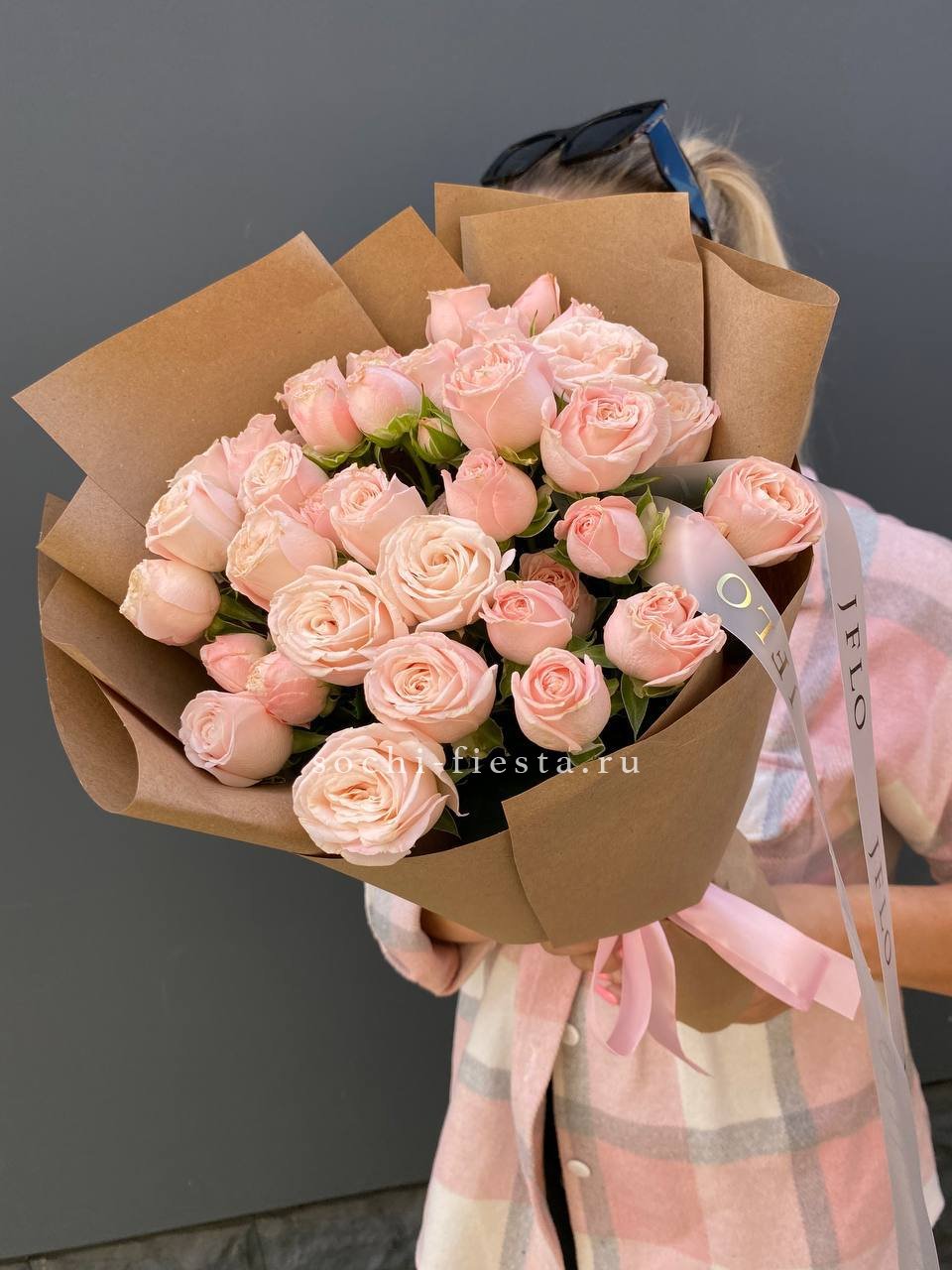 кустовые розы, лента, дизайнерская упаковка.