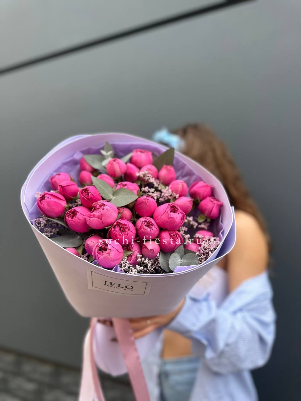 11 пионовидных кустовых роз Bombastic (или Porcelain Lace), дизайнерское оформление, лента.