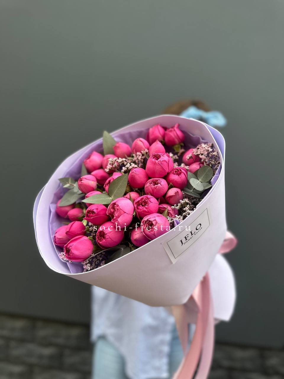 Одиннадцать бутонов раскрываются слоями густых лепестков, создавая объёмную текстуру. Розы Bombastic напоминают старинные садовые сорта и собраны в плотный силуэт с дизайнерской упаковкой.
