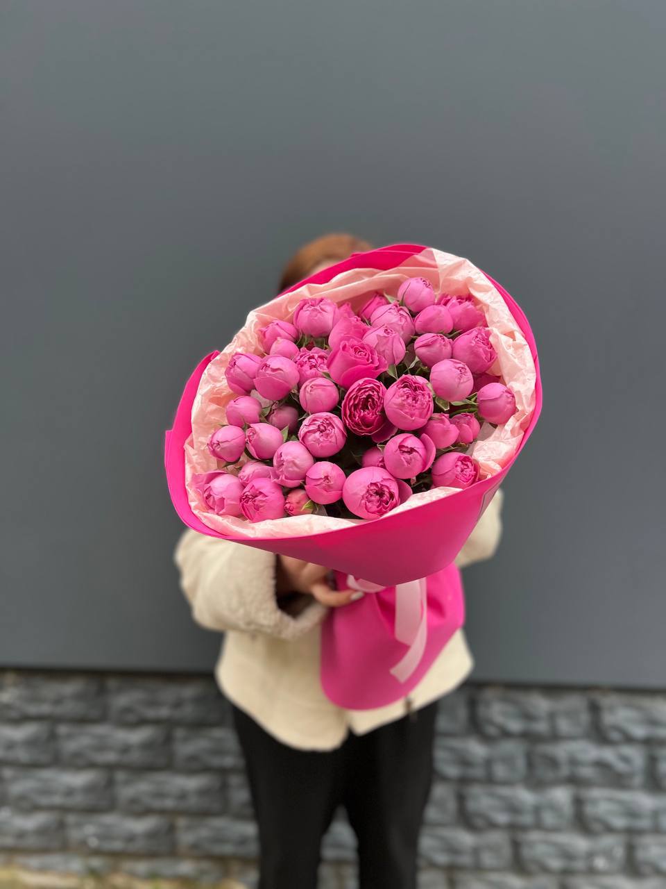 Пятнадцать кустовых роз собраны в плотную округлую форму. Мелкие бутоны создают воздушную текстуру и мягкий объём в пространстве.