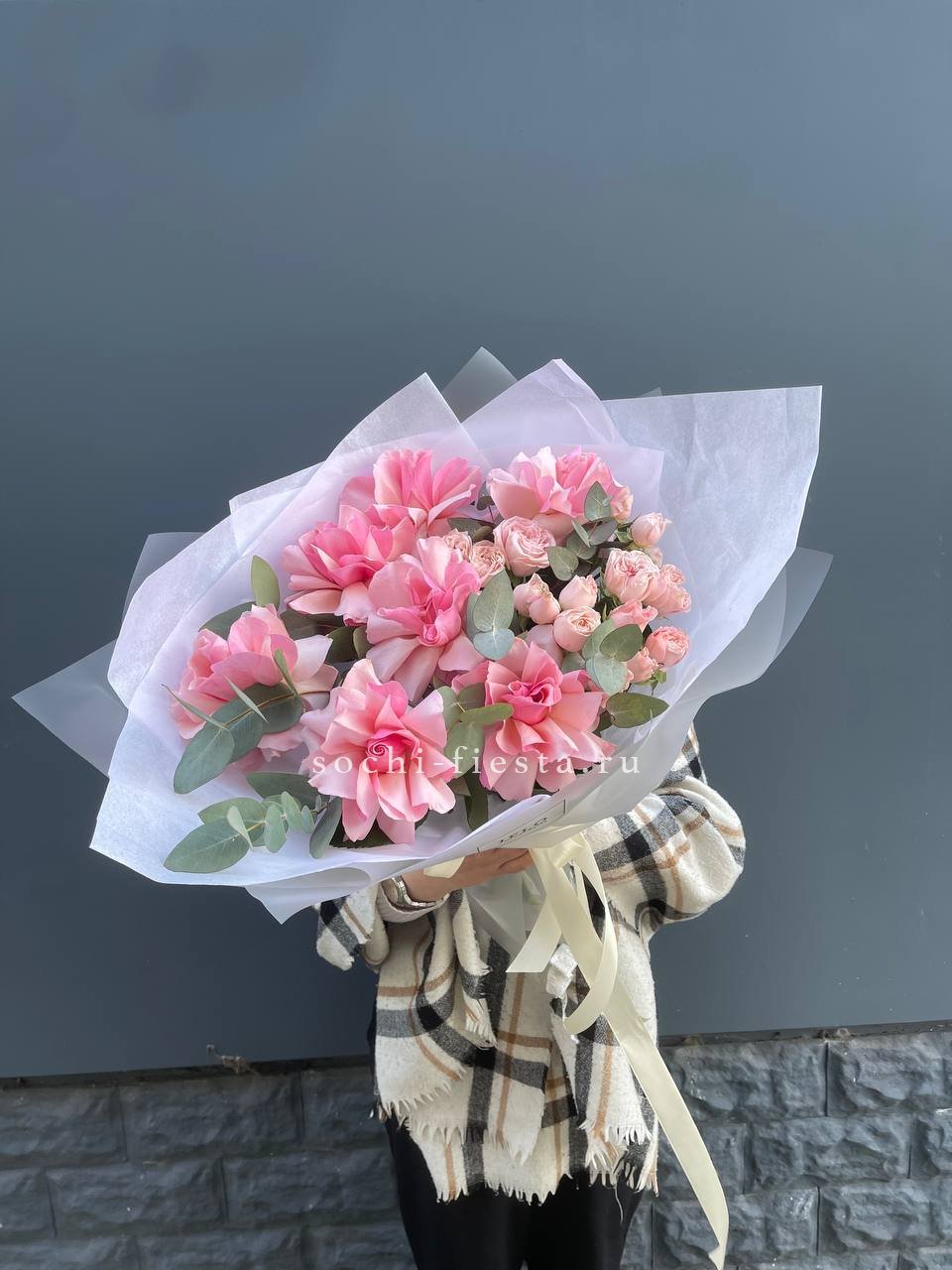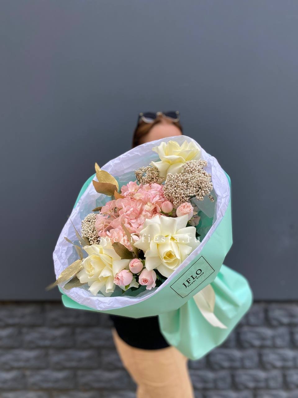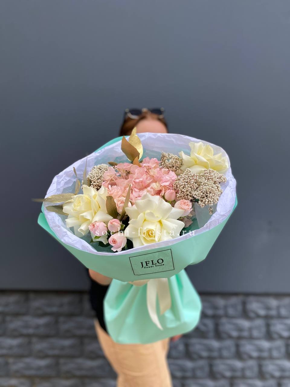 гортензия, эустома, диантус, мисти баблс, озотамус в нежном оформлении.