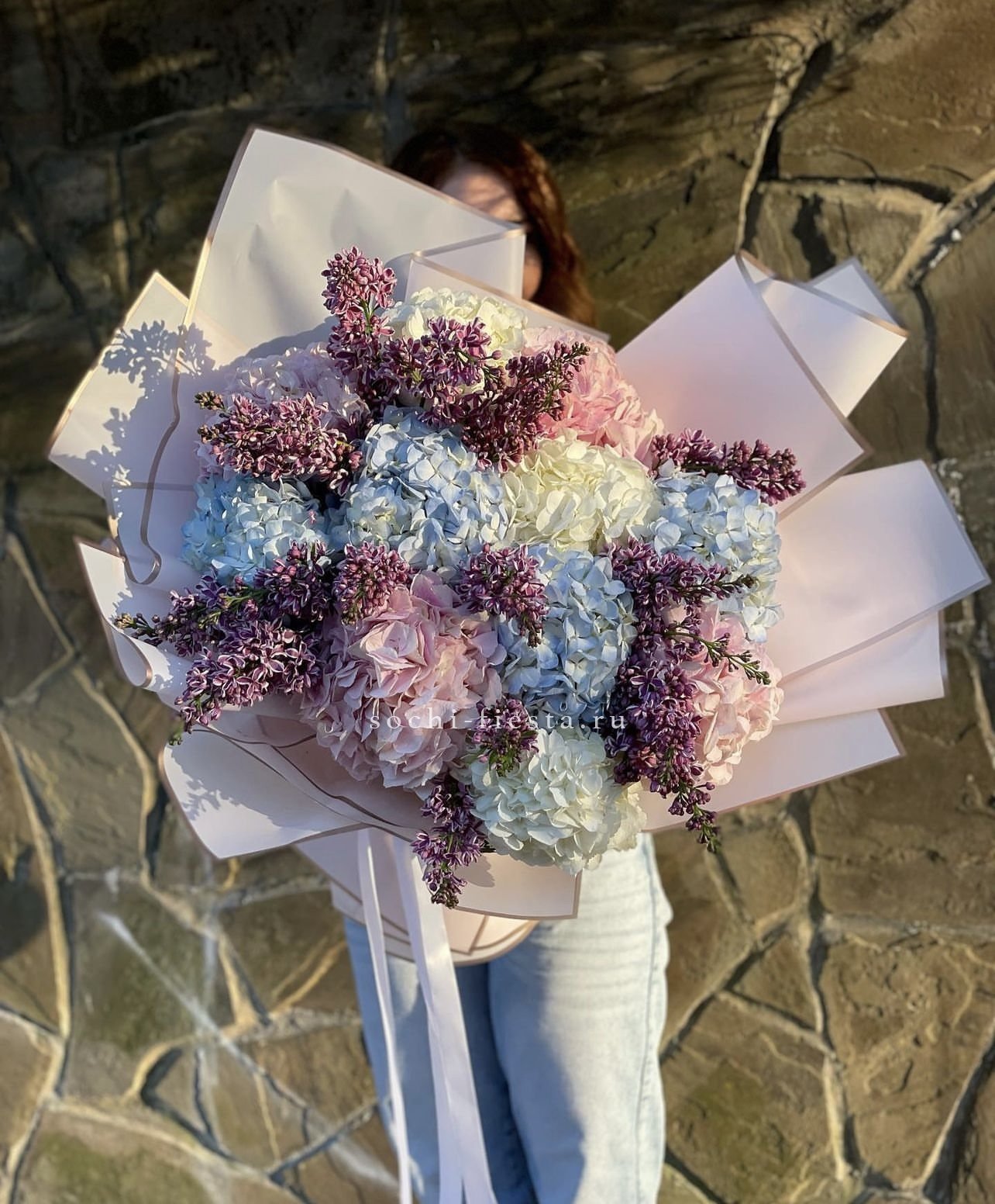 Гортензии разных оттенков соединяются с ветками сирени в пышную композицию. Объем создается за счет крупных соцветий, которые заполняют пространство мягкими облаками цвета.