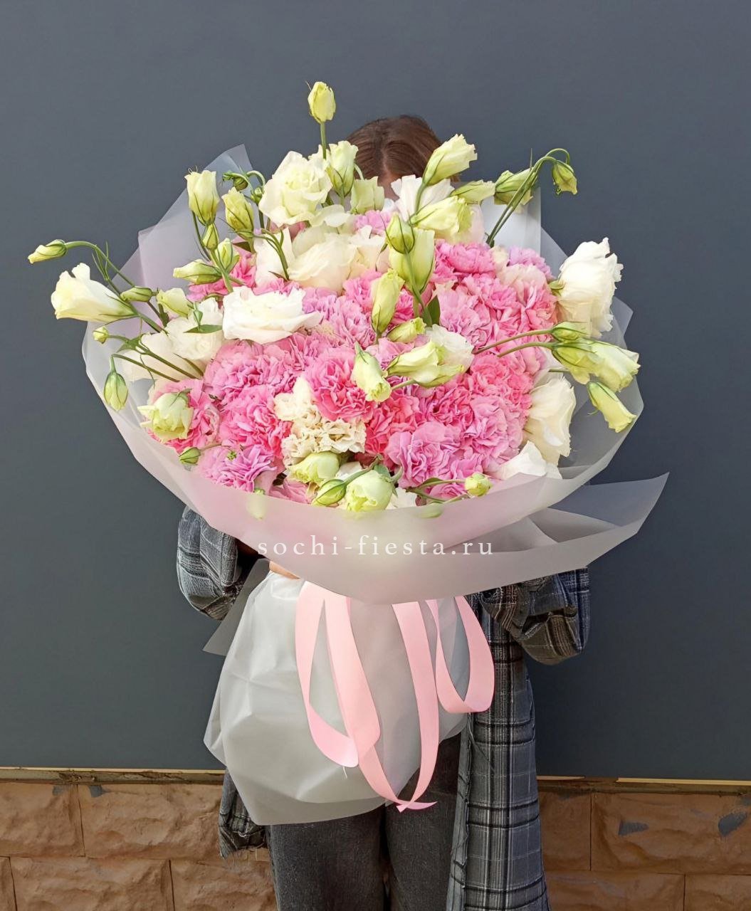 Махровые головки диантусов и многолепестковые бутоны эустом образуют плотную фактурную композицию. Каждый цветок раскрыт и виден, создавая ощущение густоты и насыщенности.